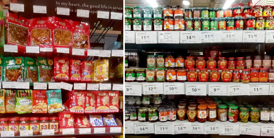 一个普遍的规律是,超市佐餐类食品货架旁鲜有顾客驻足,大部分产品生产日期还停留在2023年12月以前。笔者询问了新世纪超市调味品区相关负责人,对方直言:“提价对消费者采购榨菜的影响不是很明显,近半年来涪陵榨菜的销量依然占大头。不过各大品牌的下饭菜销量都很惨淡,整体确实是大不如前了。”