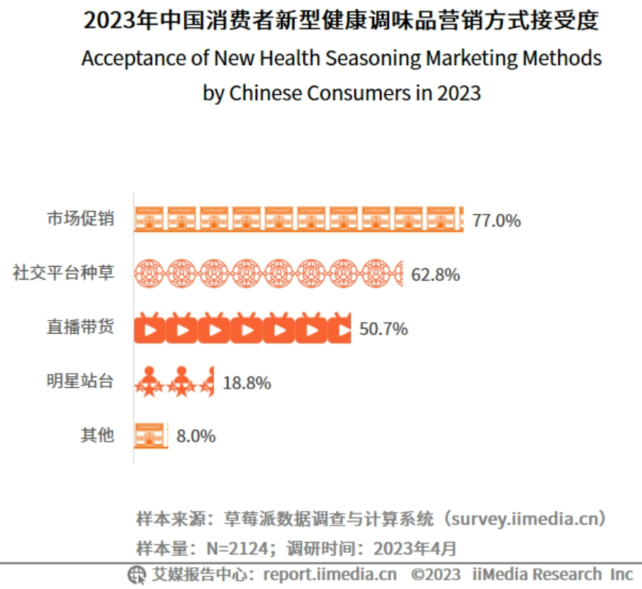 毋庸置疑,年轻客群将是涪陵榨菜未来20-30年内的主要消费者,一旦错过对该群体品牌认知和消费习惯的培育,将很难再挽回局势。根据艾媒咨询《2023年中国调味品行业产品创新专题研究报告》,消费者对于社交平台种草与直播带货等新形式营销具有更好的接受度,这也警醒着企业要不断扩大“线上+线下”的销售场景覆盖面。