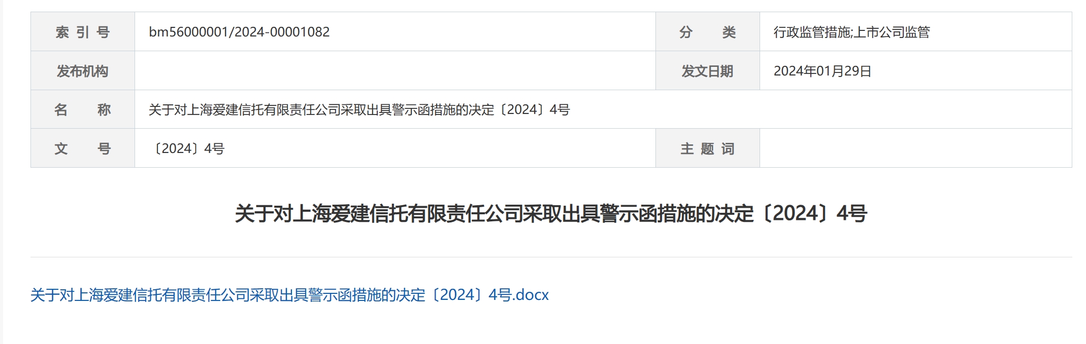 1月29日,广东证监局发布《关于对上海爱建信托有限责任公司采取出具警示函措施的决定〔2024〕4号》。