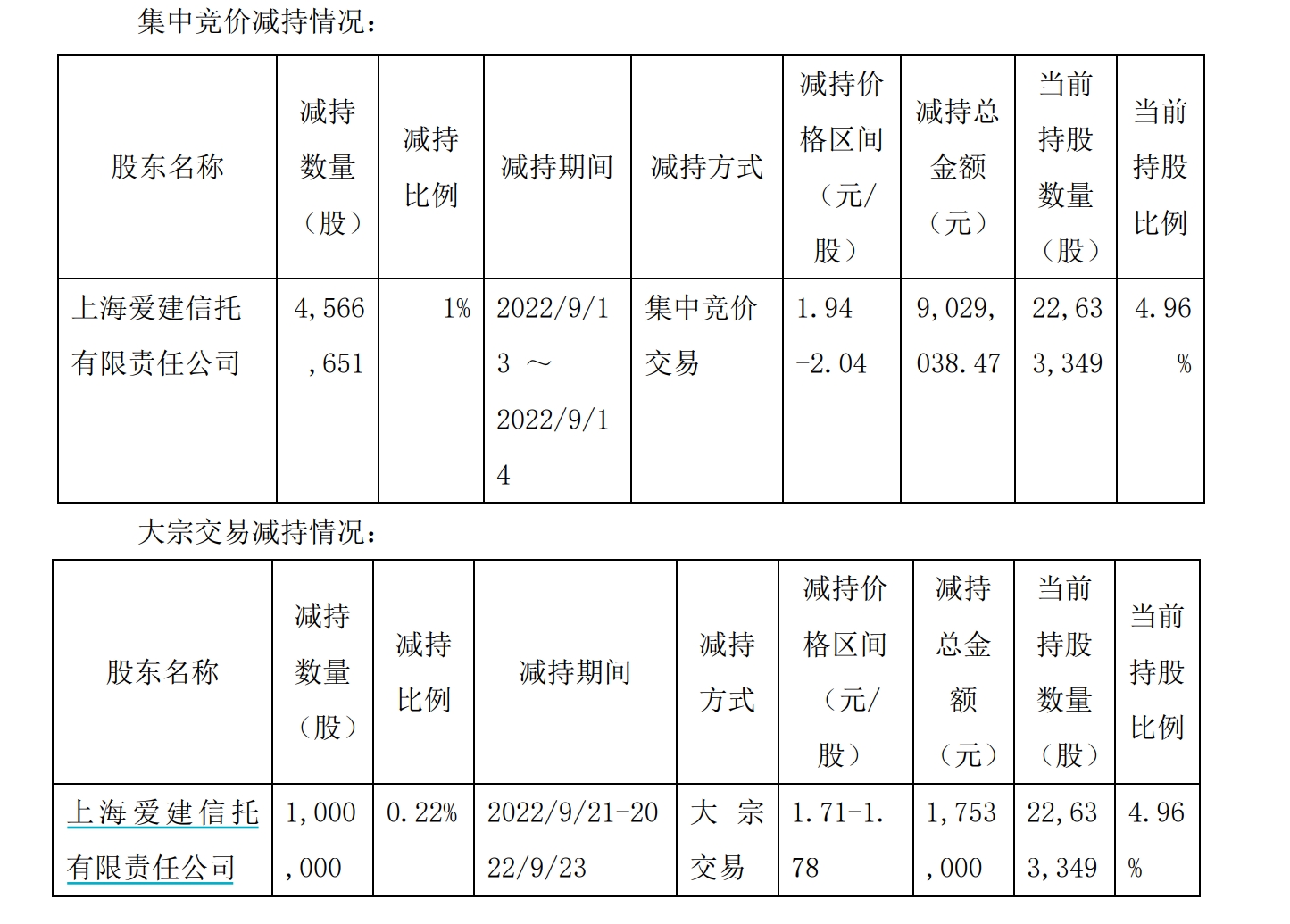 据中昌股份披露,2022年9月13日至9月14日,爱建信托以集中竞价方式减持中昌股份1%股份,减持均价为1.94-2.04元/股,减持金额902.9万元。