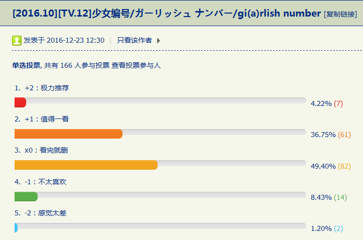 在免补避雷投票中,《少女编号》位居第二。得票数36差评率22.5%。而《少女编号》在隔壁不补可惜投票中的好评率也有13.92%。二者相差并不多,可以说也是个颇具争议的片子。那么这部作品到底是好评还是差评呢?为了确定这一点,我们再次进入投票鉴赏区,看看《少女编号》本身的评价如何: