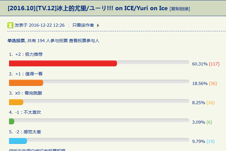 首先是本次避雷投票得票数最高,也是本季争议最大的的番剧《冰上的尤里》。该片在避雷投票中得票数57差评率是35.6%(计算方式:得票数/参与人数),比第二名《少女编号》高出13.1%。一般情况下,这样的结果已经可以证明这并不是一部值得看的作品。但把目光投向隔壁的补番推荐投票,会发现《冰上的尤里》也获得了66票,好评率20.88%的成绩,那么这片子到底值不值得看呢?