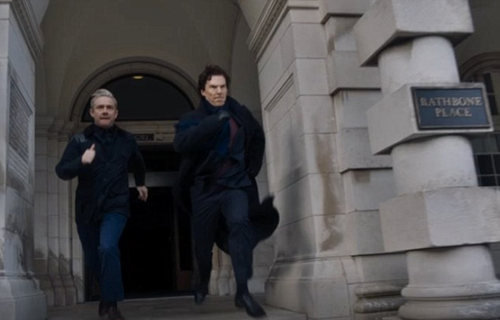 在结尾的场景中,夏洛克和华生从一栋建筑物中跑出来,出现了写有Rathbone Place的大楼指示牌。