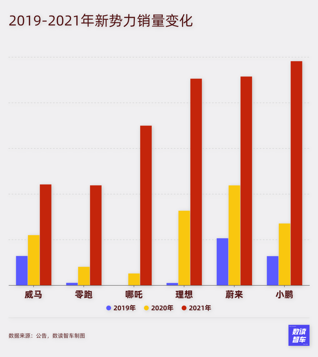 然而,一直到2021年,威马销量44152台,同比增长101%,看似增速明显,实际这一年威马已经在蔚小理零中垫底,甚至被起步更晚的哪吒轻松超越。