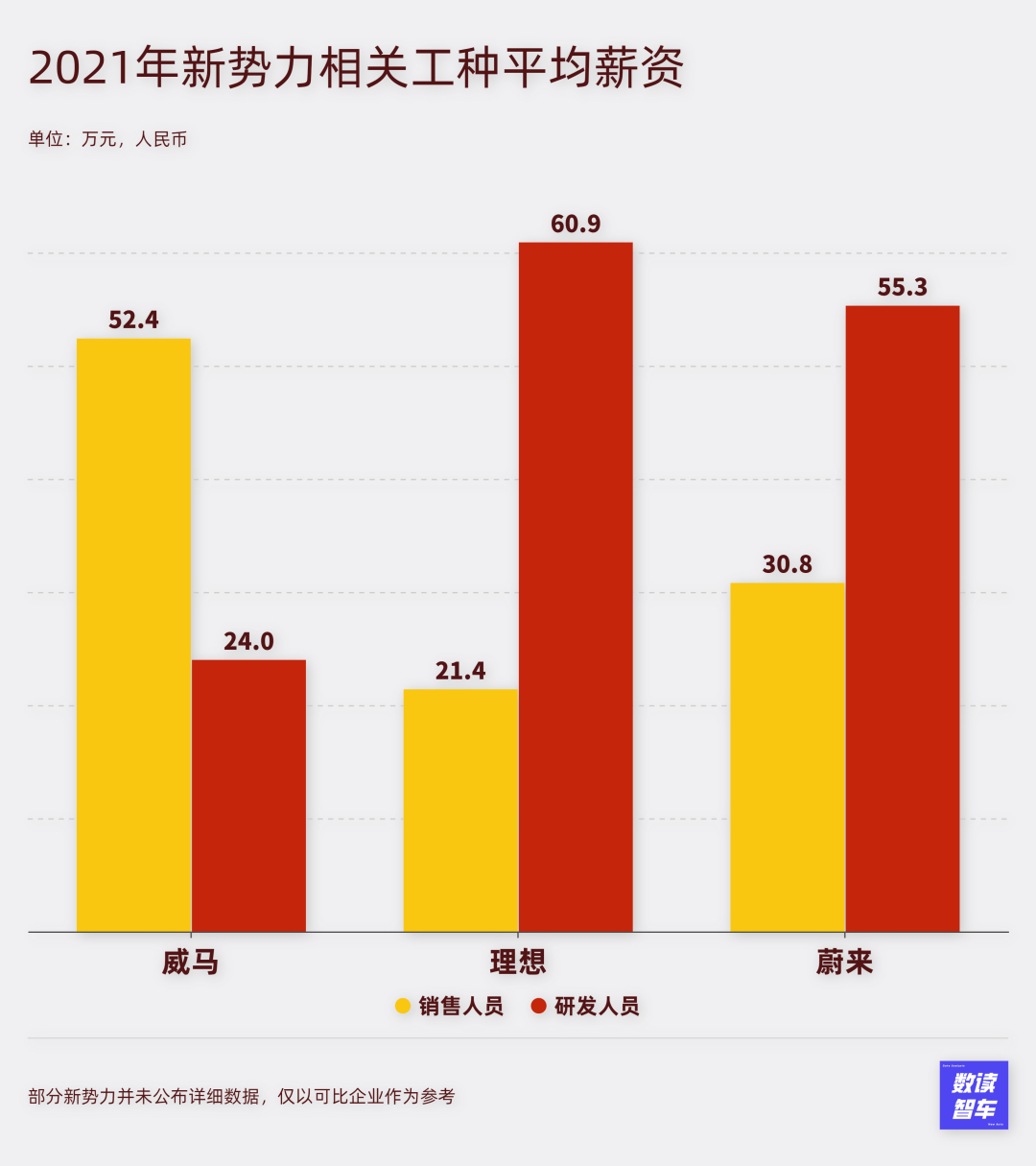 到了2021年,威马296名销售人员,薪酬开支1.55亿,人均年薪52.4万。与之对比,1141名研发人员开支2.74亿,人均年薪24万。