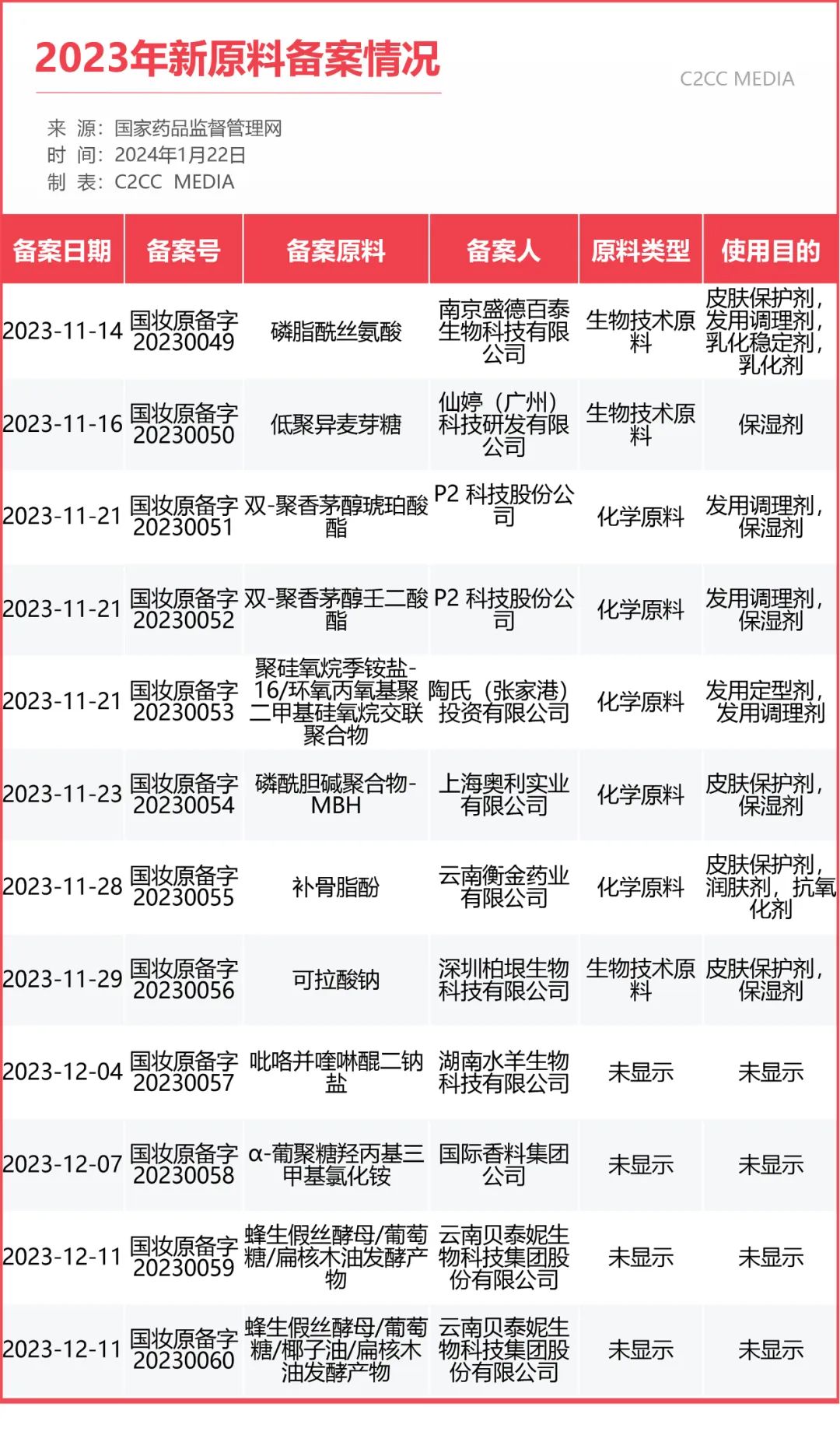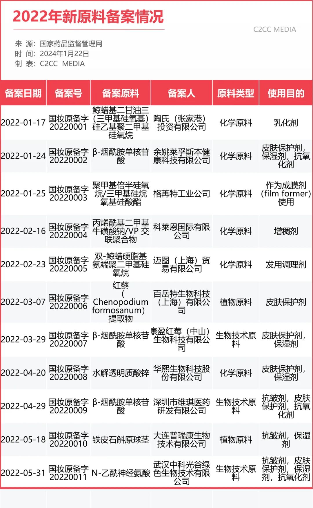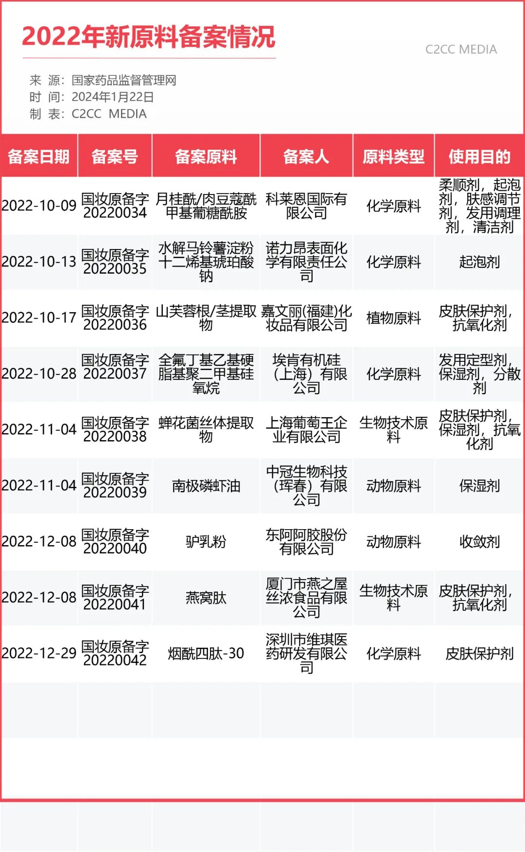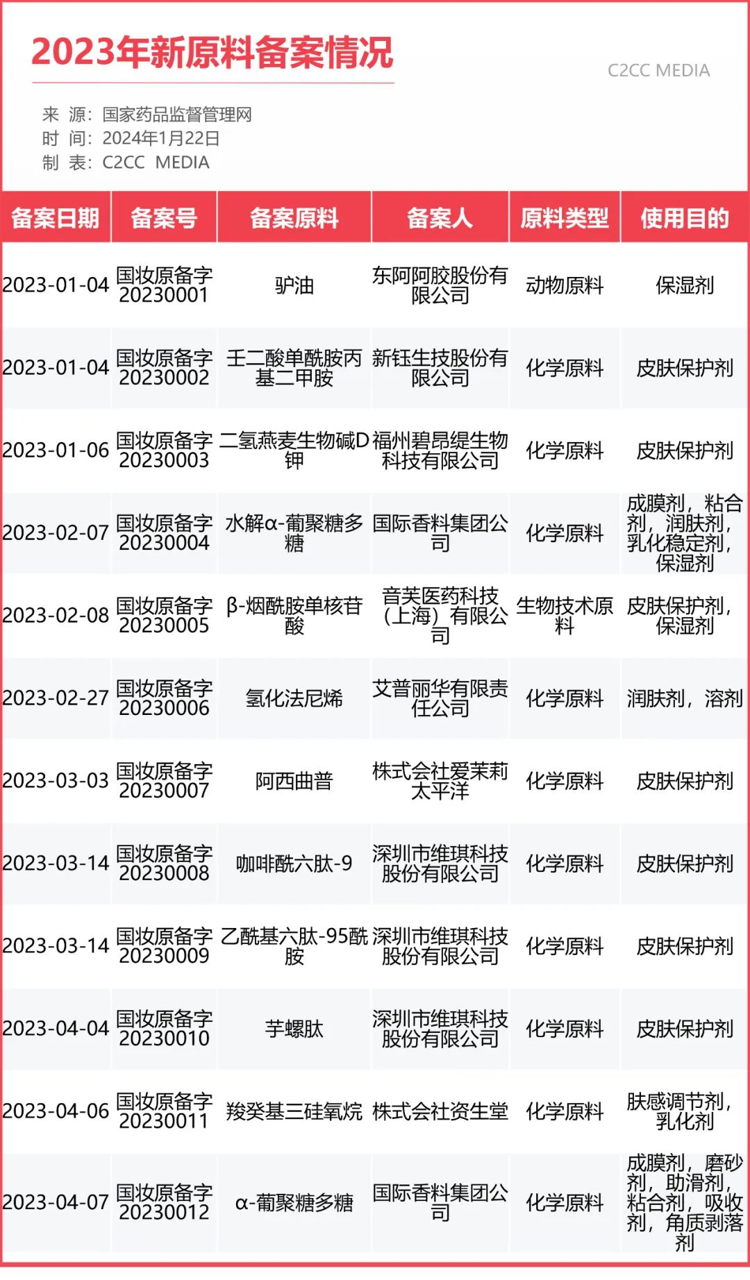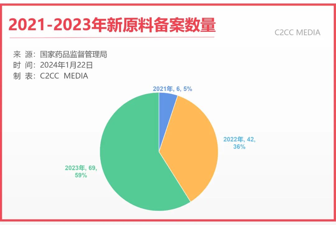 总体而言,2023年新原料备案数量超过21年与22年的总和,加上24年新备案的12个原料,23年的备案数量依旧超出10个之多。2024年第一个月还未结束,其备案数量已达两位数,其增长速度相比23年只增不减。按此增长速度,24年新原料备案总数破百有望。