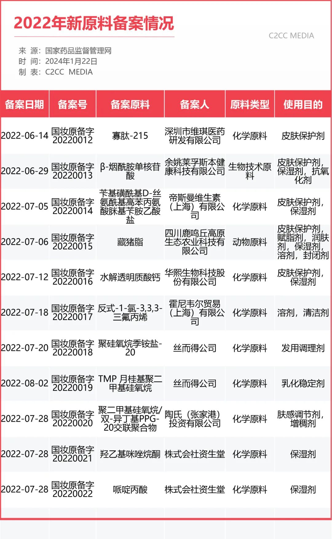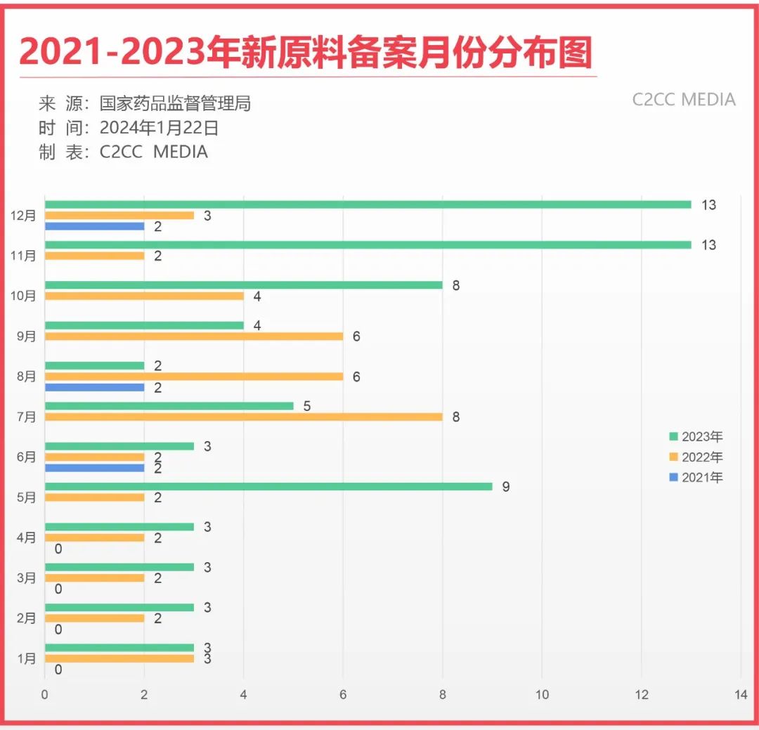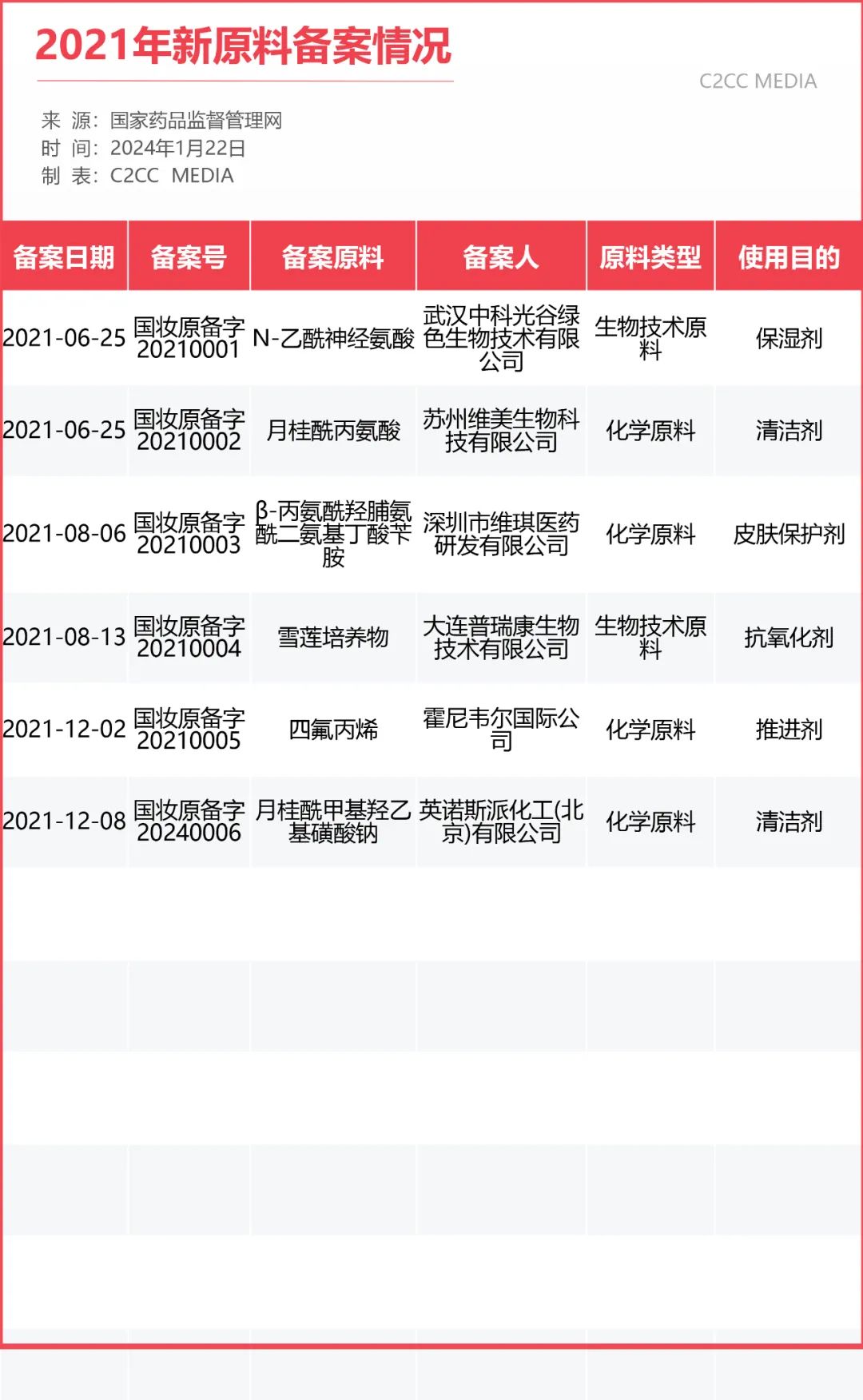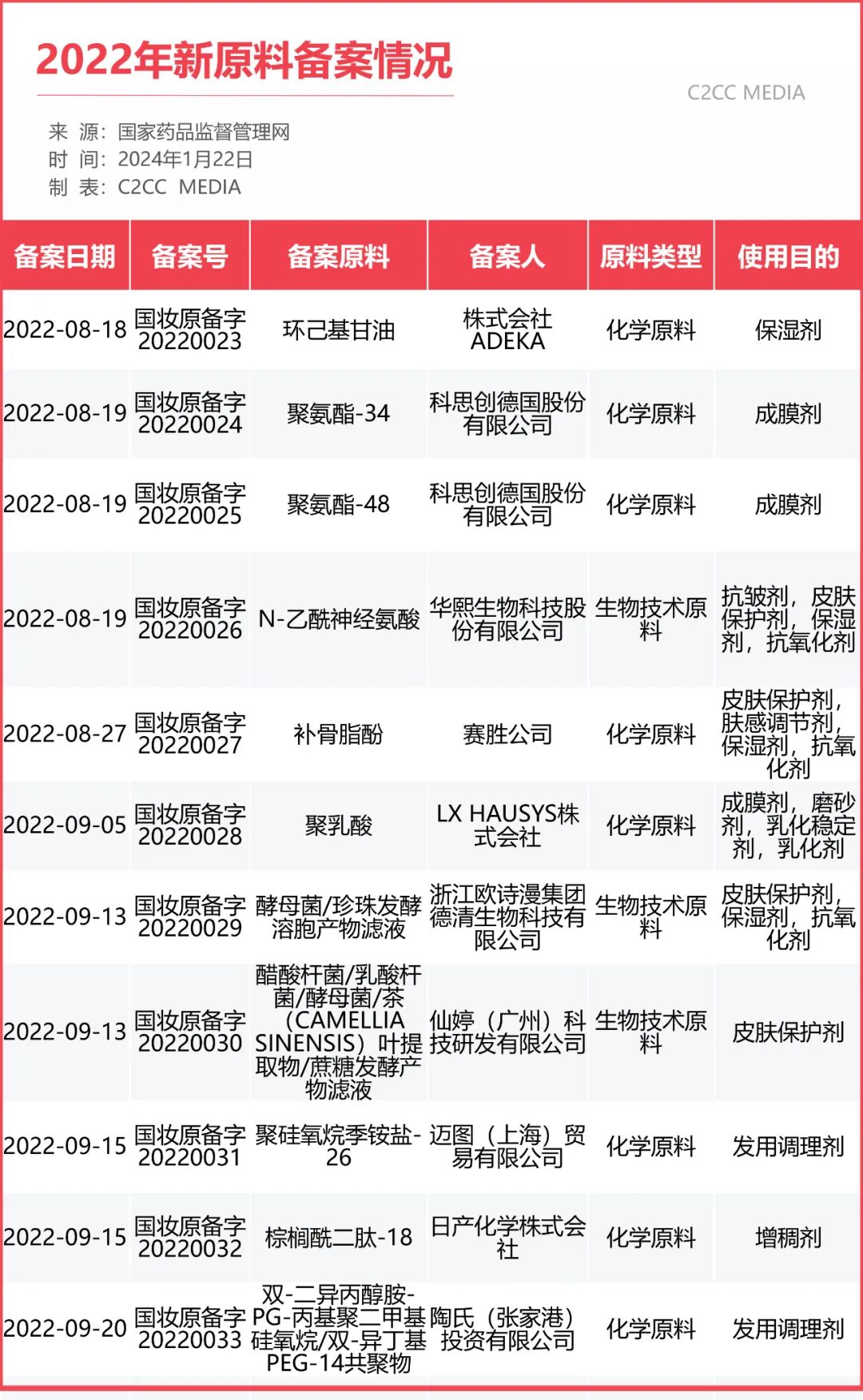 总体而言,2023年新原料备案数量超过21年与22年的总和,加上24年新备案的12个原料,23年的备案数量依旧超出10个之多。2024年第一个月还未结束,其备案数量已达两位数,其增长速度相比23年只增不减。按此增长速度,24年新原料备案总数破百有望。