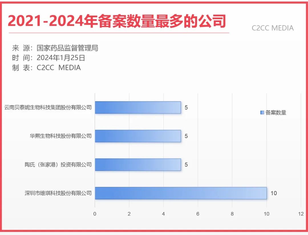 若以备案数量论成绩,那么深圳市维琪科技股份有限公司(深圳市维琪医药研发有限公司)目前就是百里挑一的尖子生,它以10个新原料备案数量的绝对优势成为行业内的领头羊,其中β-烟酰胺单核苷酸备案两次,除去2024年新备案的两个原料,其它8个均已进入监测期。其次是陶氏(张家港)投资有限公司、华熙生物科技股份有限公司、云南贝泰妮生物科技集团股份有限公司,这三家公司皆备案了5个新原料。
