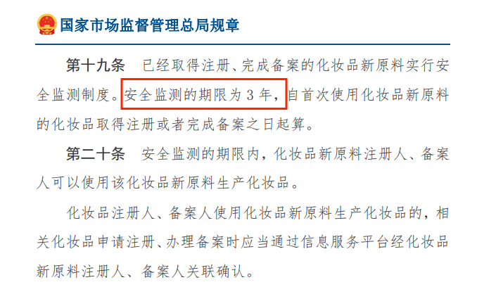 根据《化妆品注册备案管理办法》第十九条规定,已经取得注册、完成备案的化妆品新原料实行安全监测制度。安全监测的期限为3年,自首次使用化妆品新原料的化妆品取得注册或者完成备案之日起算。