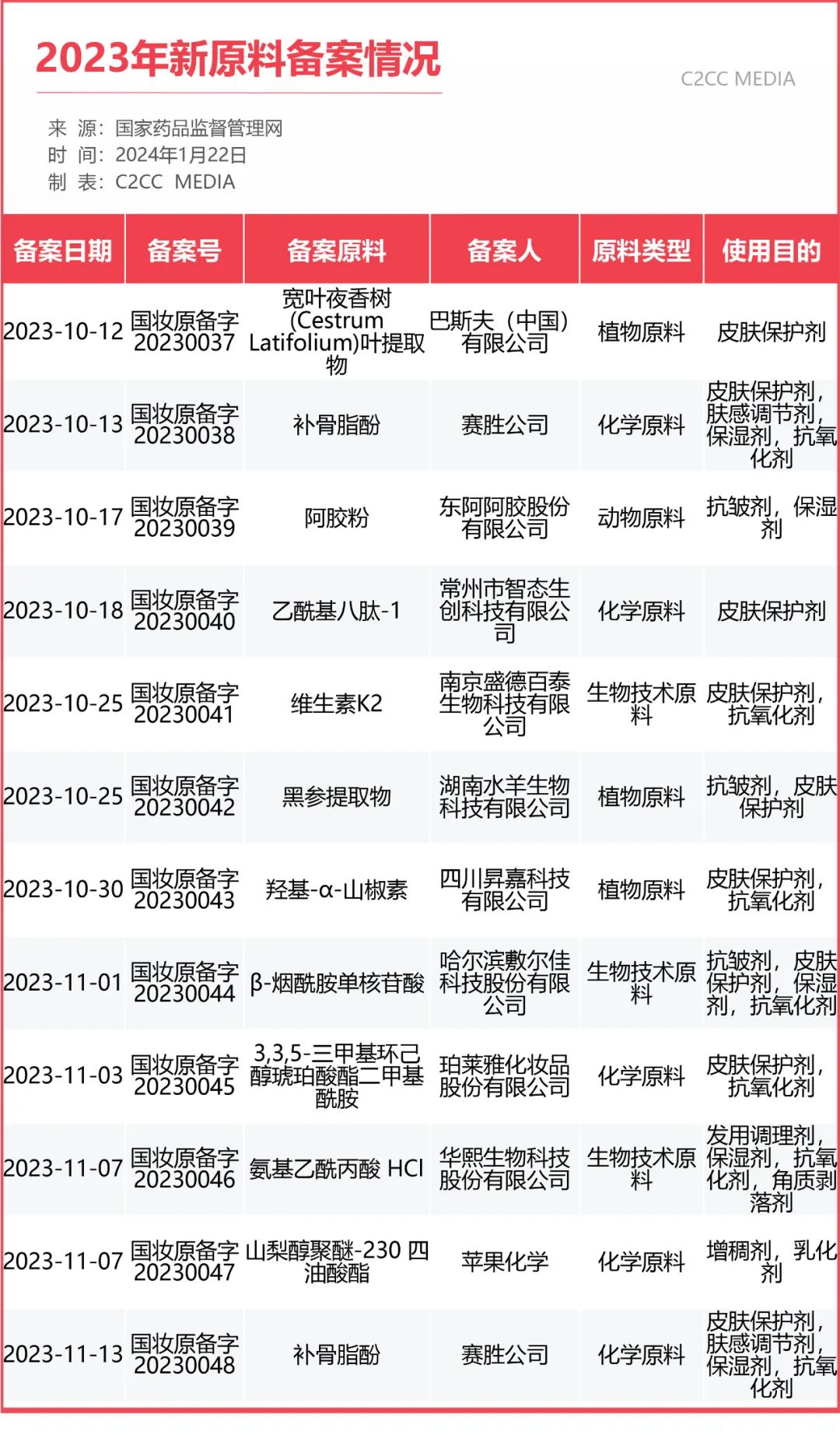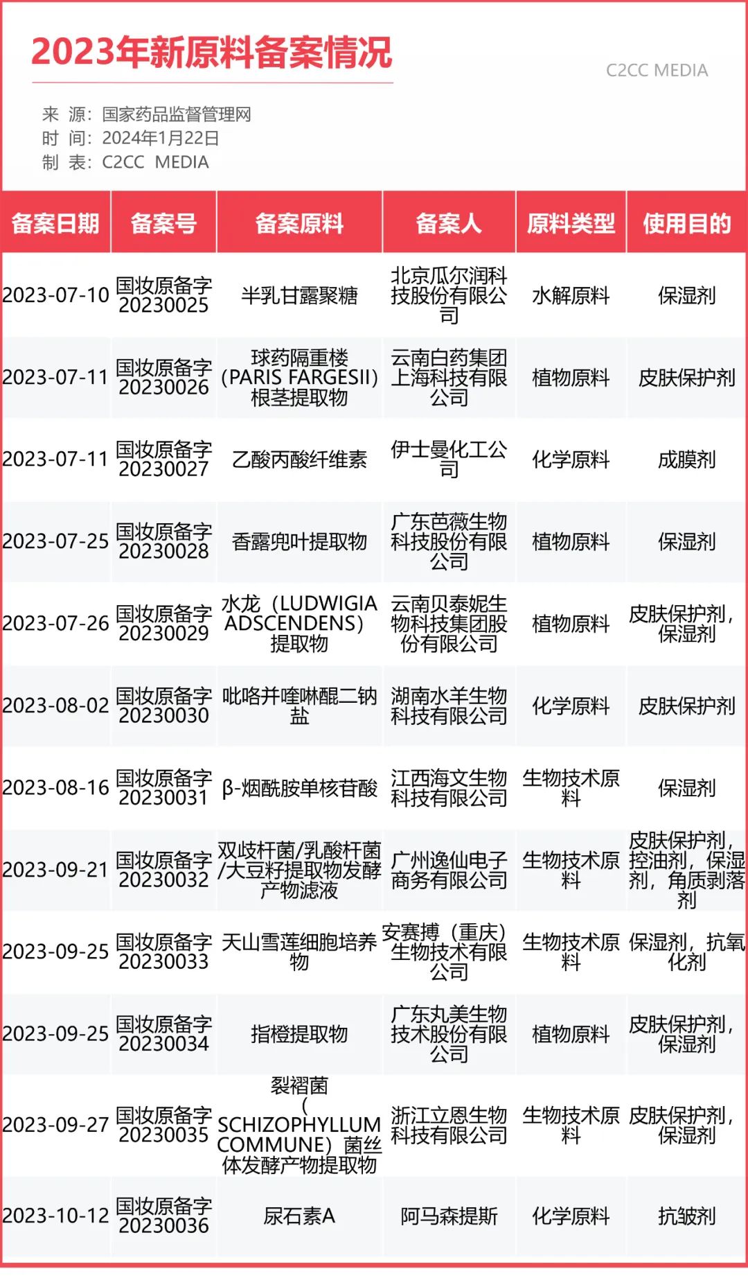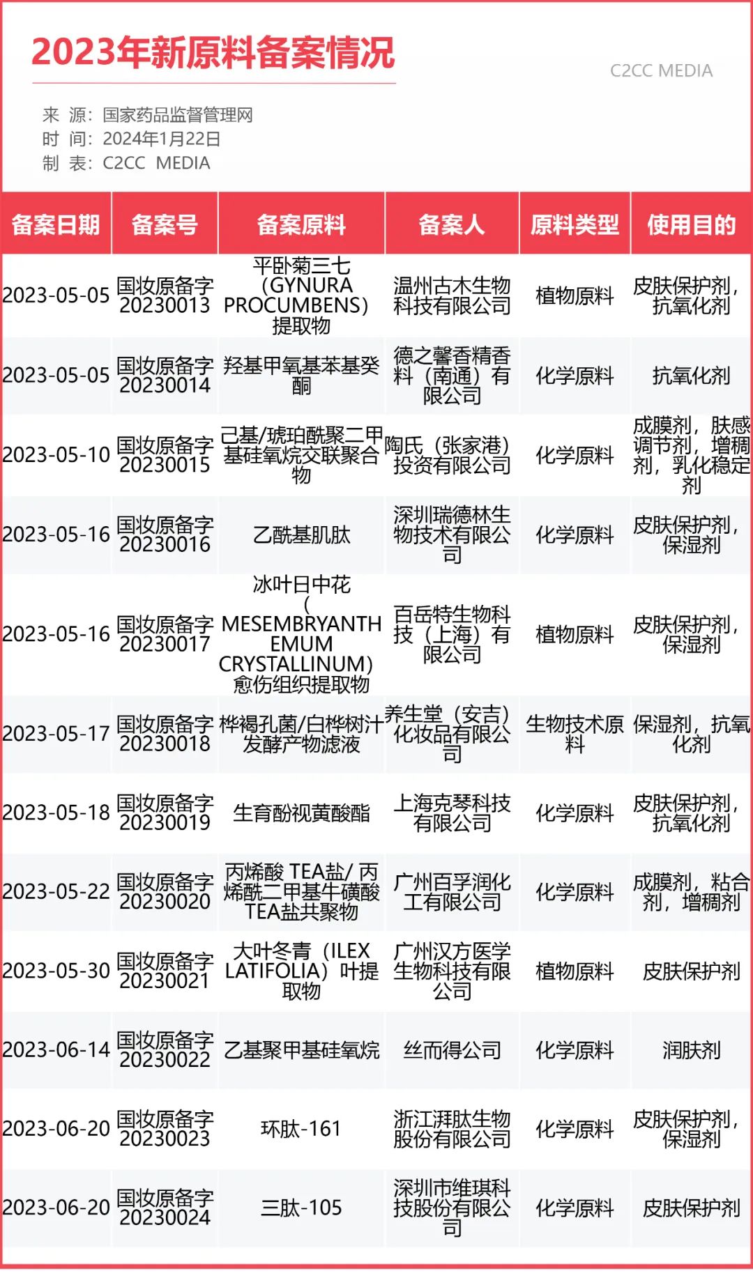 据C2CC传媒X新妆统计,2021年至今已有近20个植物新原料备案成功。如2023年,云南白药备案的“球药隔重楼(PARIS FARGESII)根茎提取物”,贝泰妮备案的“水龙(LUDWIGIA ADSCENDENS)提取物”,四川昇嘉科技备案的“羟基-α-山椒素”等等。