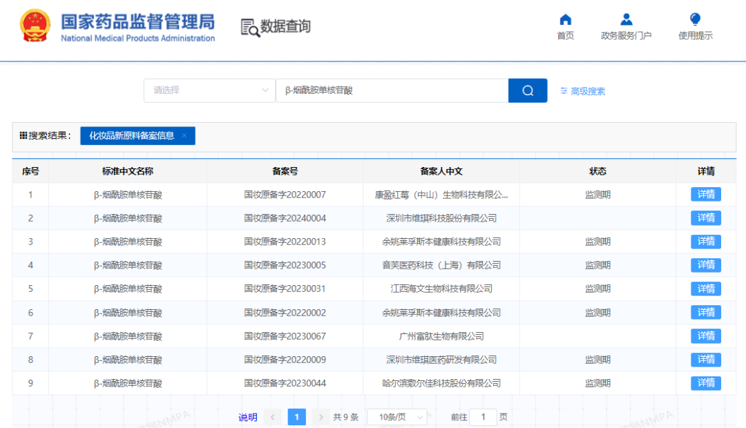 截至目前,β-烟酰胺单核苷酸由7家企业共备案了9次,热度最高。据了解,β-烟酰胺单核苷酸也被称为NMN,近年来在保健品领域内十分火爆,其宣称的抗衰老功效,深受消费者的认可和信赖,并且冠以“不老神药”的称号。