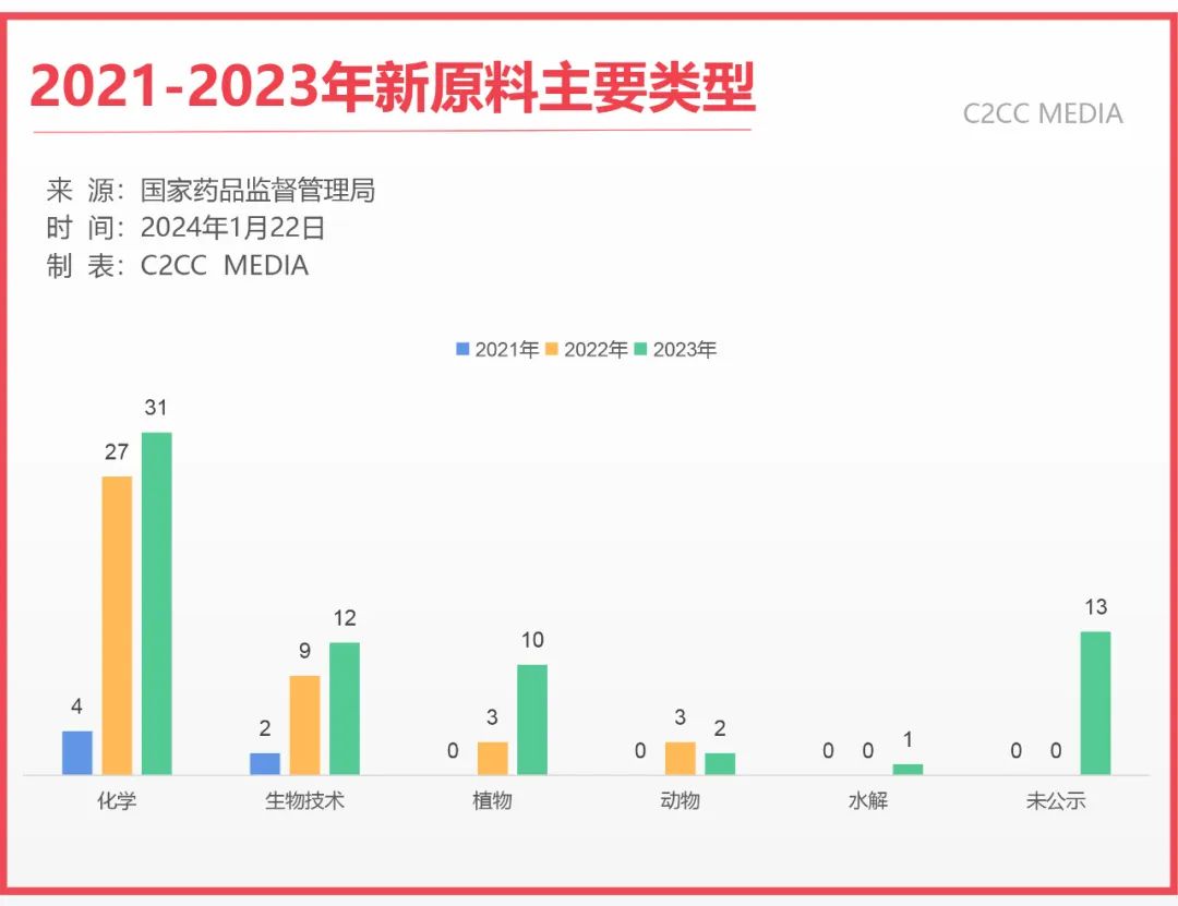 从原料类型来看,化学原料占大头,生物技术原料次之。除去2023年未公示的13个原料,2021年到2023年共备案的104个新原料中,化学原料有62个,约占总数60%,生物技术原料23个,约占22%,植物原料13个,约占12%,动物原料和水解原料共6个,约占6%。