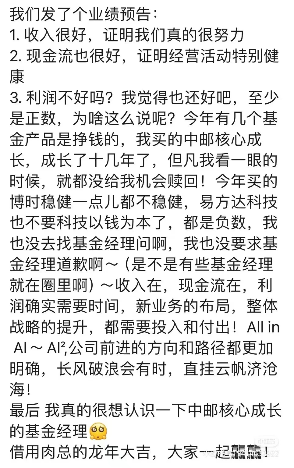 对此, 该名证代在朋友圈里表示:“收入在,现金流在,利润确实需要时间,新业务的布局,整体战略的提升,都需要投入和付出!All in AI~AI²,公司前进的方向和路径都更加明确。”