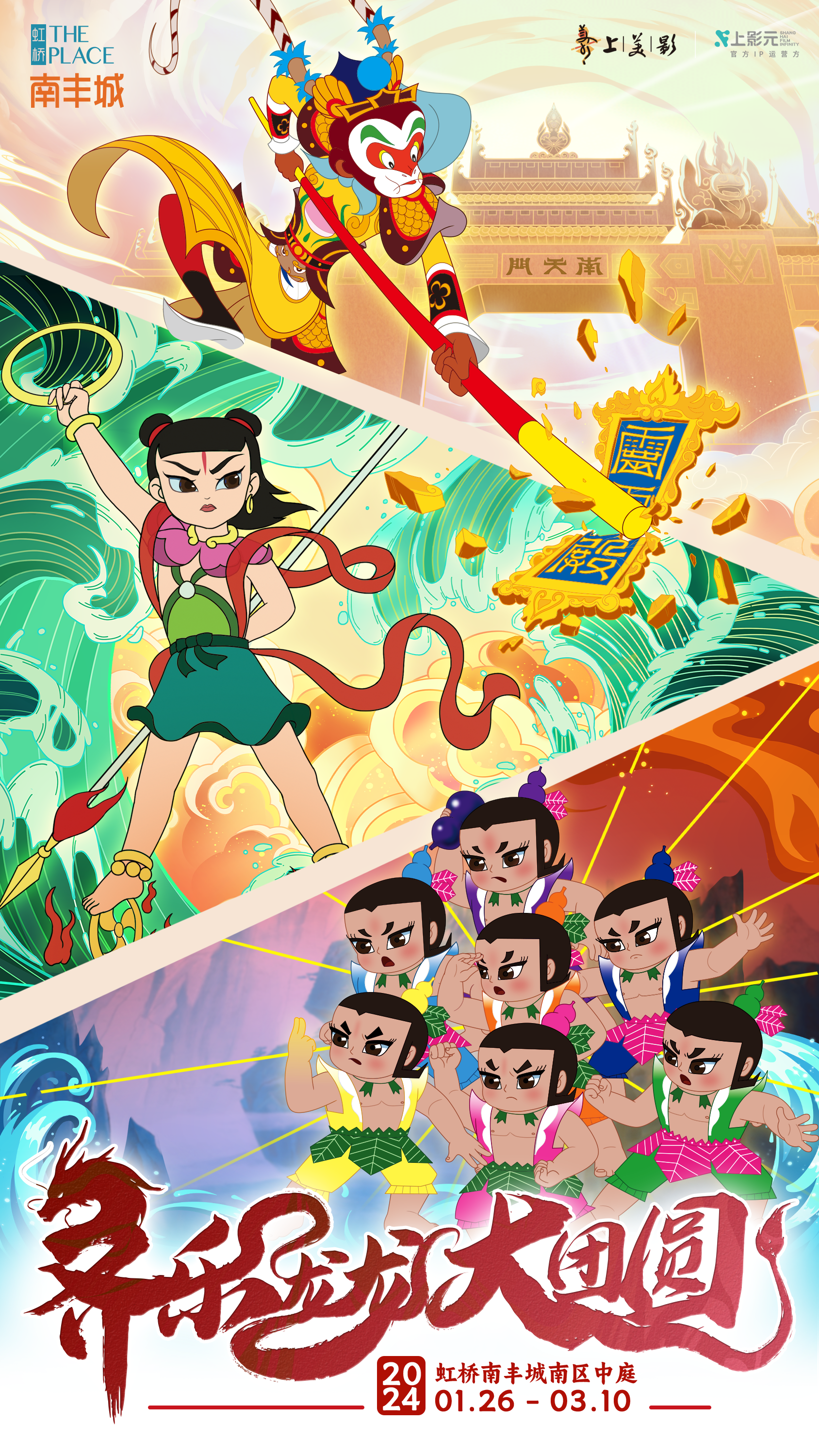 祥龙昂首,万象启新。2024年1月26日至3月10日,虹桥南丰城携手上影元,联动上海美术电影制片厂经典动画《大闹天宫》《哪吒闹海》《葫芦兄弟》,在新旧交替之际打开“通天之门”,迎接孙悟空、哪吒和葫芦娃三大国民动画英雄入场,来到大家身边,在场内再现天宫“齐乐龙龙大团圆”的奇幻景象,邀请大家加入新春盛宴,一起共贺新春。