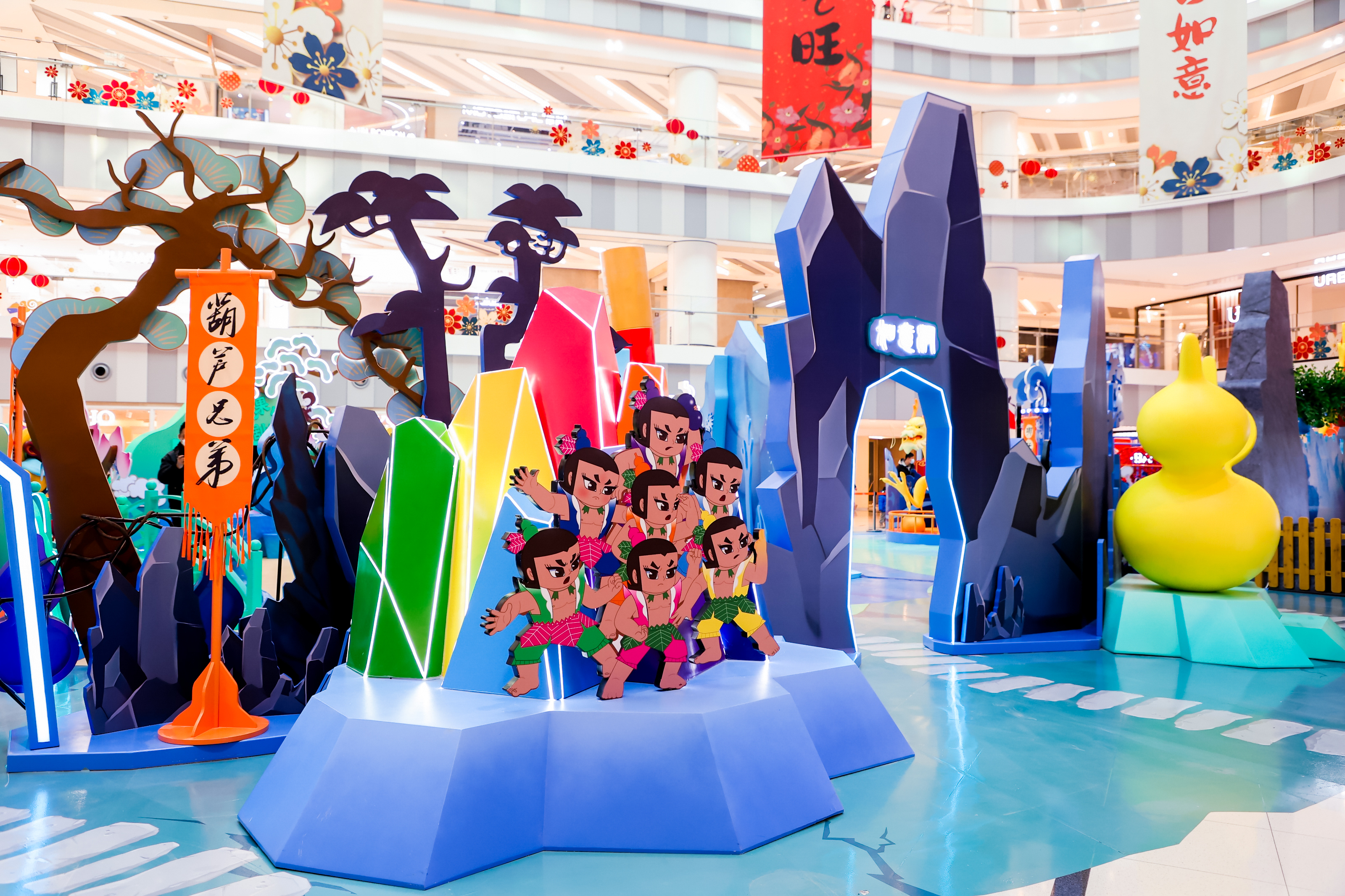 步入虹桥南丰城南区L1中庭,灵霄殿在烟雾之中若隐若现,殿旁层层帷幔笼罩,在灯笼的照映下仿佛身处天宫。绕至灵霄殿背后,即可解锁“大闹天宫”区域的花果山,不仅有眼睛会转动的悟空庙,还有5米高的如意金箍棒伫立在中央,孙悟空盘坐在花果山前的模样让人立即联想到《大闹天宫》中操练小兵的经典片段。“哪吒闹海”区域特别呈现东海龙王,龙身盘旋于“海”上,龙尾一飞冲天打造视觉冲击。哪吒脚踩风火轮,手持火尖枪,锚定龙王弱点,大战一触即发。远处“葫芦兄弟”区域传出此起彼伏的呼喊,葫芦七兄弟邀请大家前去七色山一聚,爷爷的葫芦藤结出巨型葫芦,那是葫芦娃们胜利的象征,如意洞内蛇精和蝎子精正悄悄谋划着下一次的偷袭……