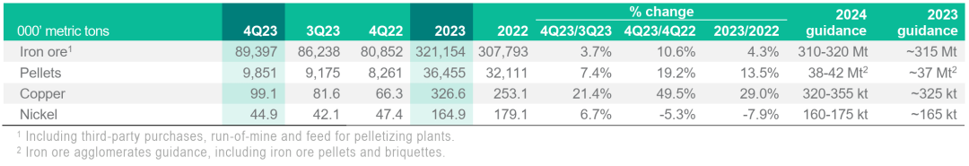 1月30日,淡水河谷发布的2023年产销量报告显示,其去年铁矿石产量达到3.212亿吨,同比增长4.3%,超出3.15亿吨的产量指导目标。铜产量达到32.66万吨,同比增长29%,略高于32.5万吨的产量指导目标;镍产量为16.49万吨,同比减少8%。