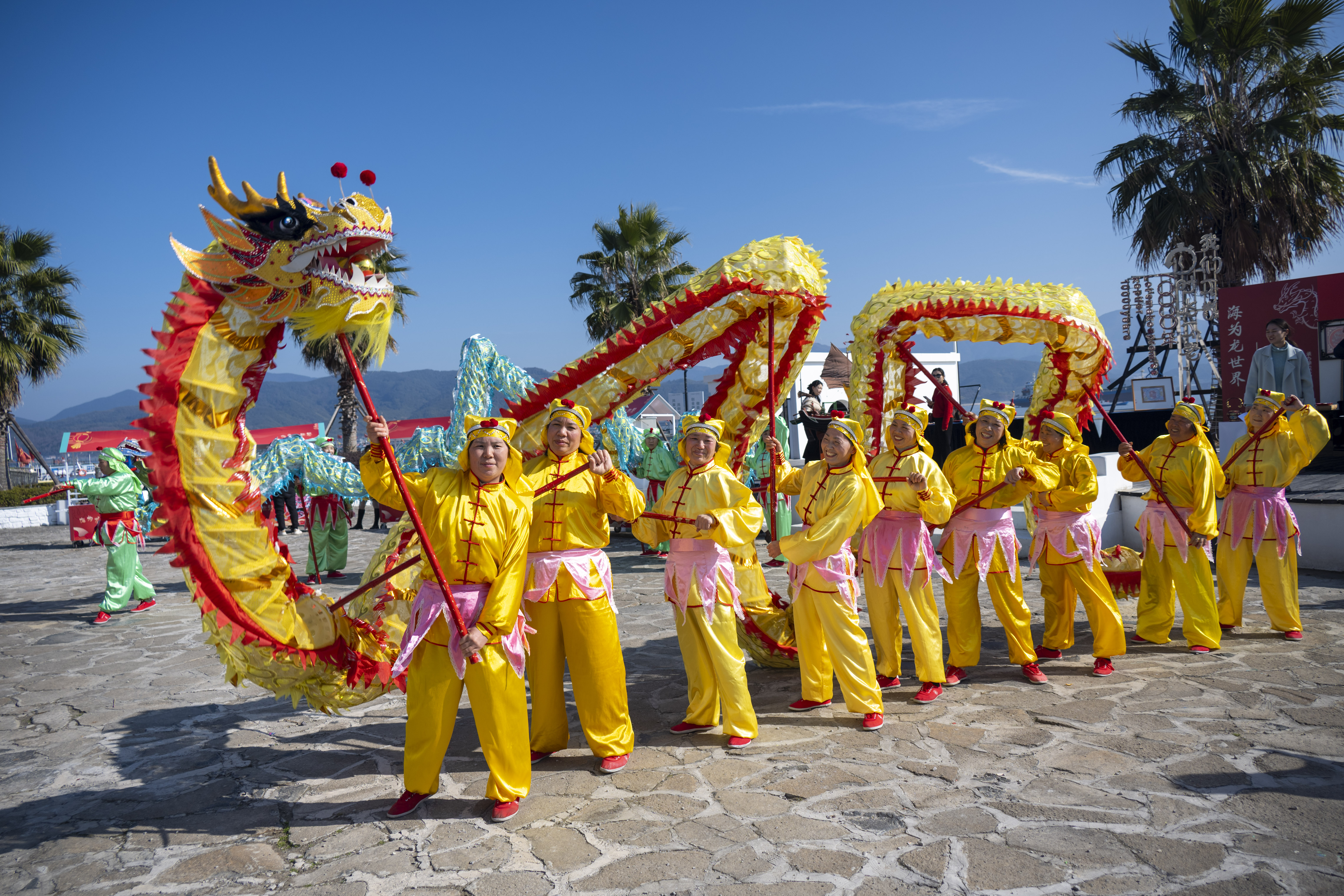 随着鼓点响起,村民们身着节日盛装,舞动着两条五彩缤纷的长龙,为观众呈现了一场“龙腾宁海湾”的视觉盛宴,拉开了庆龙年活动序幕。现场还准备了丰盛的小吃和香甜浓郁的奶茶等特色饮品,让游客在欣赏非遗的同时,畅享冬日美好“食光”。