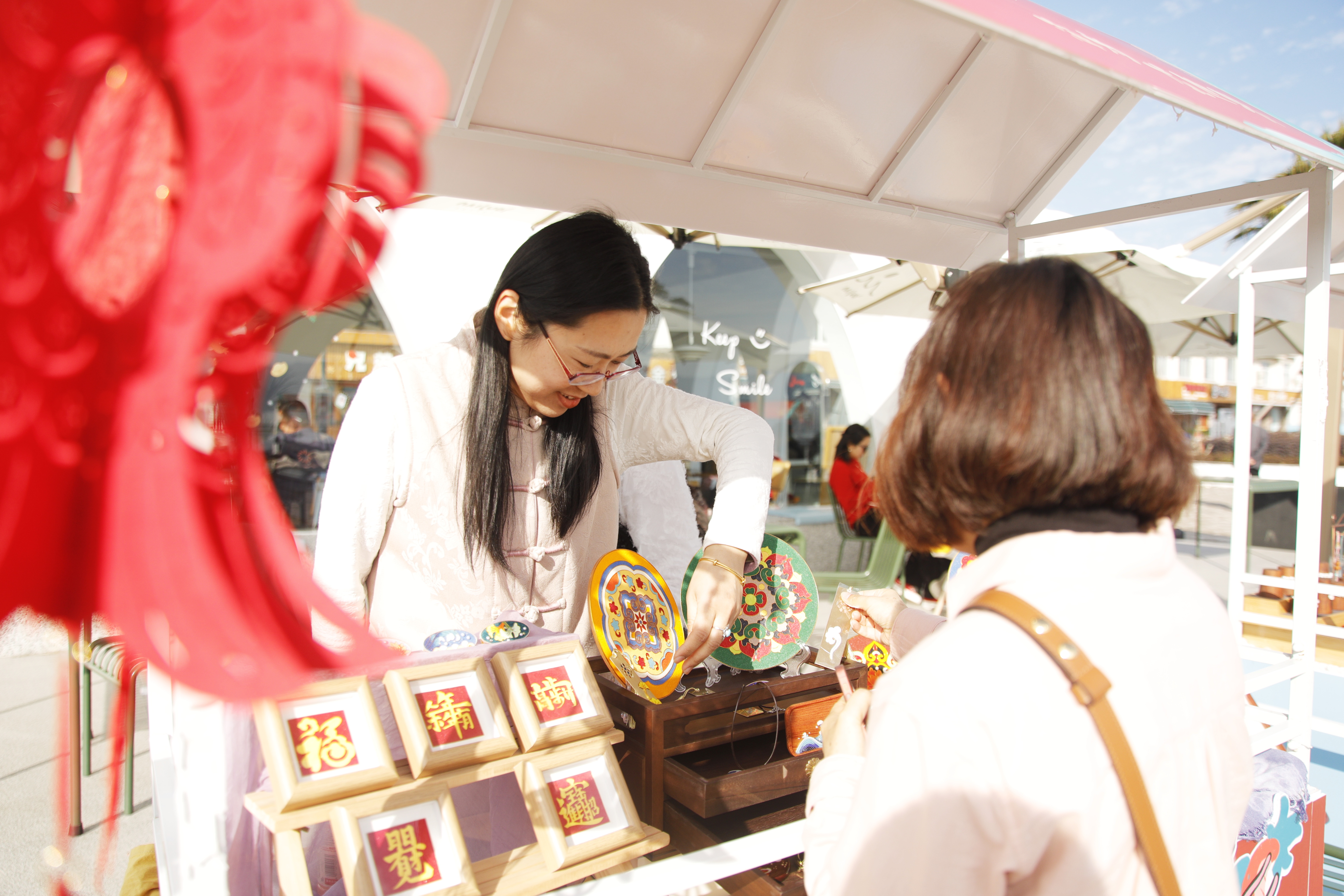 “快看,这个‘双龙戏珠’粉桶好漂亮,寓意也好。”华丽多彩的泥金彩漆技艺受到了不少人的惊叹和赞美,纷纷驻足观赏。“图案和寓意都非常好,正巧年后儿子大婚,我们想把这个充满年味的新春好彩头带回家。”嘉兴游客张女士说。