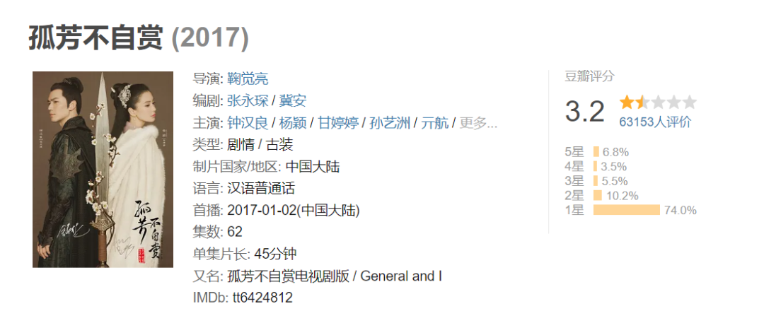 随便举例一部剧就能感受到当时的数据水分:知名的“抠图剧”《孤芳不自赏》,豆瓣评分只有3.2,评分人数不超过7万(这还是现在的数据),但当时显示的前台点击量却超过200亿,超过2018年爱奇艺夏天表现最好的《延禧攻略》。