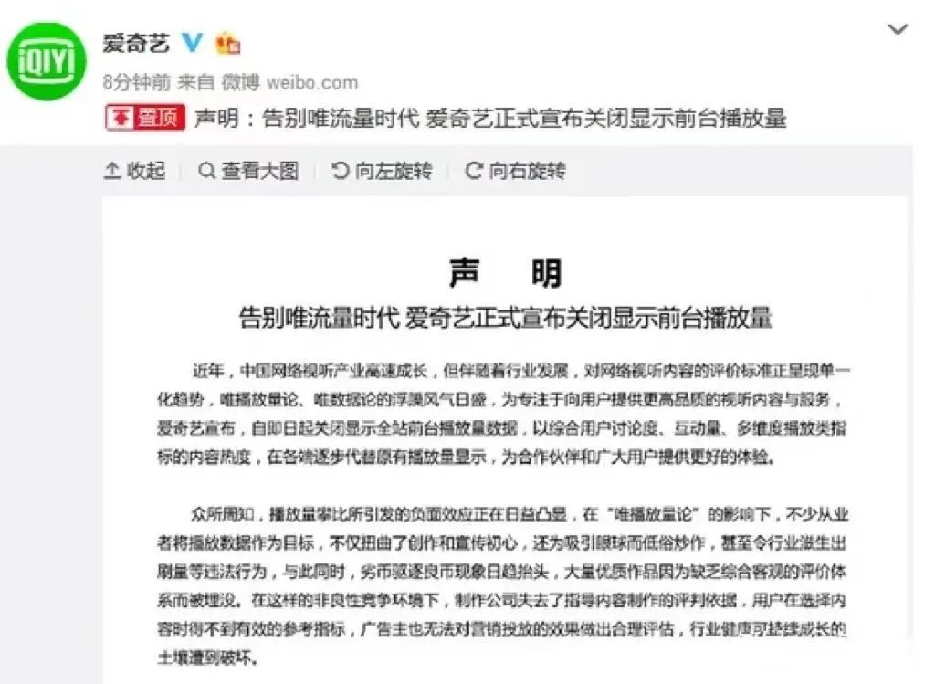 此后,率先作出响应的是爱奇艺。2018年9月3日, 爱奇艺正式宣布关闭显示前台播放量,改用热度作为新的衡量标准,算法包含了用户观看行为、互动行为、分享行为等等,但热度值的具体算法并未公开。