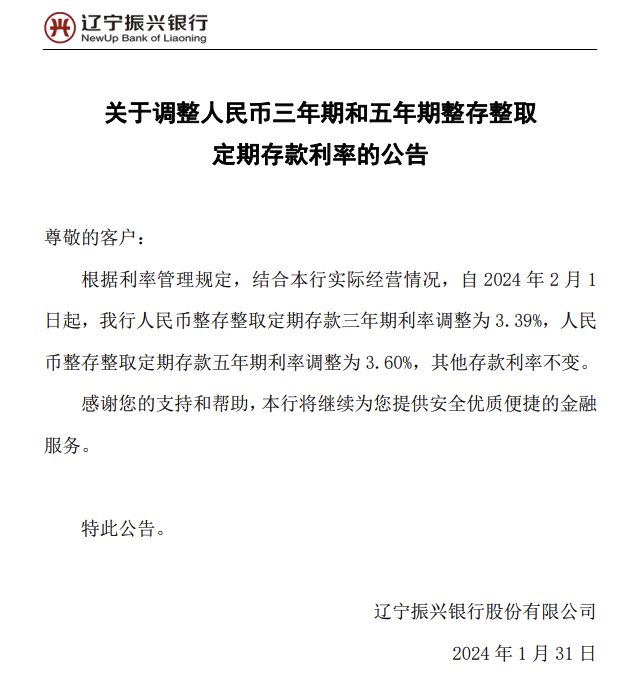 1月31日,辽宁振兴银行股份有限公司发布公告,自2024年2月1日起,该行人民币整存整取定期存款三年期利率调整为3.39%,人民币整存整取定期存款五年期利率调整为3.60%,其他存款利率不变。