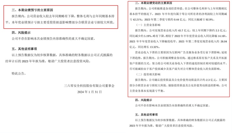 在2023年半年度业绩预告中,三六零对“本期业绩变动的主要原因”作了较大篇幅的阐述。其中包括主营业务影响和投资相关影响两大方面,“营业总收入下滑的主要原因为互联网广告及服务业务受行业下滑影响,延续下滑趋势”;“公司确认投资损益及公允价值变动损益共计约-2.3亿元,主要因部分合联营企业亏损较大所致”。当时,三六零表示,剔除投资损益及公允价值变动损益的影响,其主营业务基本实现盈亏平衡。