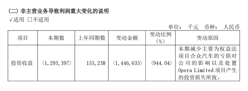 比如说,2022年度三六零的归母净利润为亏损22.04亿元,主要受投资收益为负数的影响。2022年年报显示,三六零在该年度的投资收益为-12.93亿元,变动比例达-944.04%。这是受权益法核算的合众汽车亏损的影响,以及处置Opera Limited项目产生的投资损失的影响。