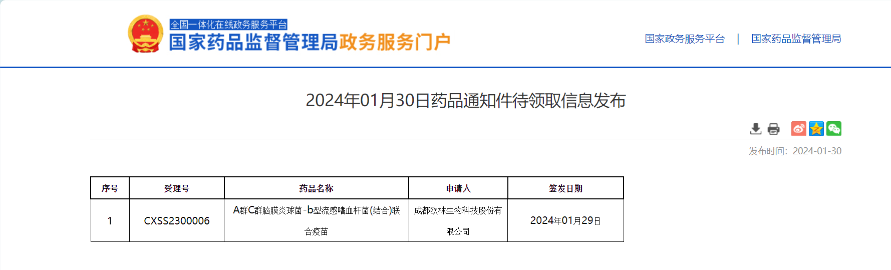 1月30日,国家药监局(NMPA)公示药品通知件待领取信息。涉及产品为国内疫苗公司欧林生物的A群C群脑膜炎球菌-b型流感嗜血杆菌(结合)联合疫苗(AC-Hib联合疫苗)。该产品未获得批文。另外,丁香园insight数据库显示,该产品“上市申请未被批准”。