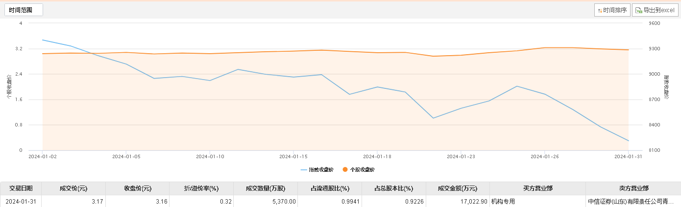 1月31日,青岛银行今日大宗交易成交5370万股,成交额1.7亿元,占当日总成交额的60.76%,成交价3.17元,较市场收盘价溢价0.32%。