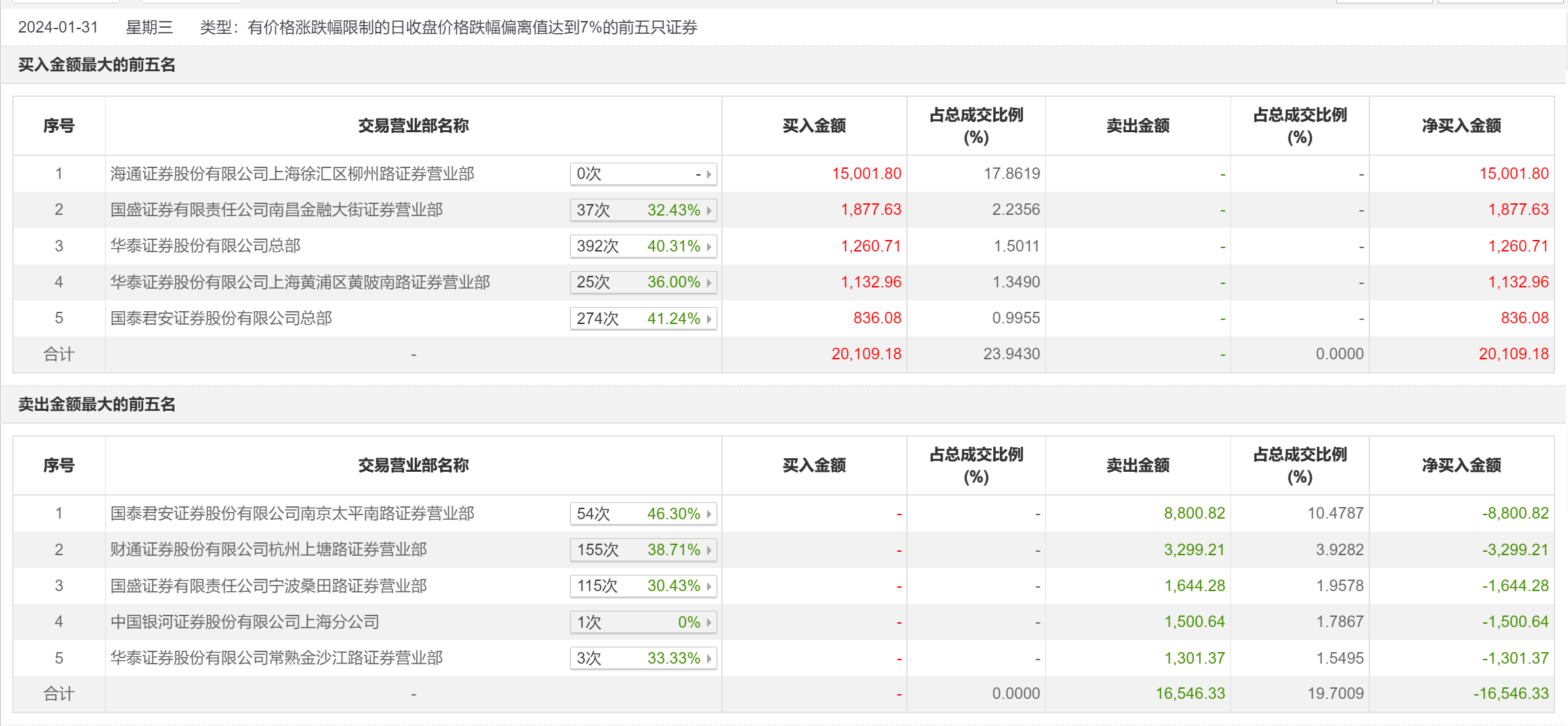 1月31日,中华企业今日跌停,全天换手率达3.67%,振幅达2.88%。龙虎榜数据显示,营业部席位合计净买入3562.86万元。其中,作手新一(国泰君安证券南京太平南路证券营业部)、财通证券杭州上塘路证券营业部分别卖出8800.82万元、3299.21万元;海通证券上海徐汇区柳州路证券营业部、国盛证券南昌金融大街证券营业部分别买入1.50亿元、1877.63万元。