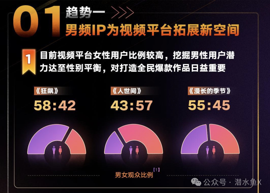 与此同时,精品剧的全年龄层也拓展了女性观众的口味。《2023 IP风向标》显示,《狂飙》男女性别比例为58:42,《漫长的季节》则为55:45。前段时间的《似火流年》,作为一部男频剧,观众性别占比更高的反而是女性,达到59.77%。可见,男女频的池子壁垒,确实正在消融。