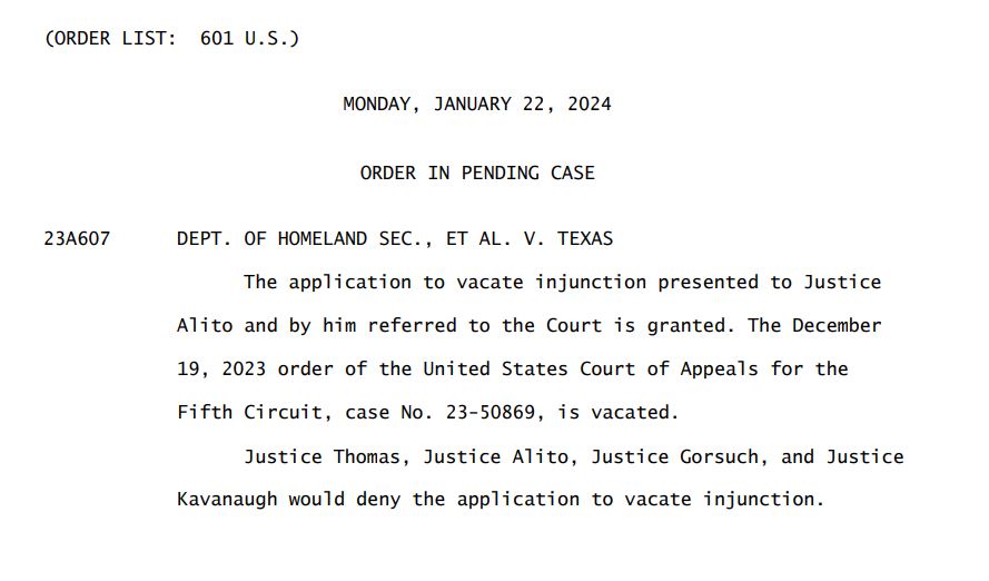 联邦最高法院1月22日公布的紧急裁决结果只有三句话:允许撤销禁令;第五巡回上诉法院2023年12月19日做出的决定被撤销;最高法院9名大法官中有4人反对撤销禁令。