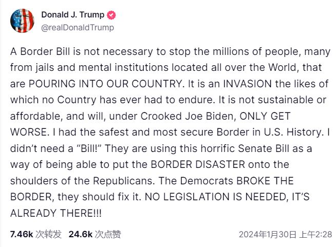 针对参议院新起草的移民法,特朗普也在社交媒体发声反对,强调民主党人必须自己解决自己制造的边境问题。