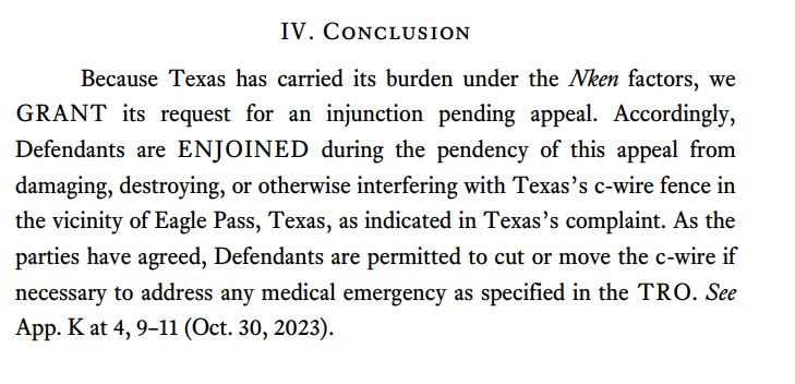 第五巡回上诉法院12月公布决定,要求各联邦机构不得继续破坏、摧毁、干扰得州政府在伊格尔帕斯附近修建的铁丝网,除非出现紧急医疗救护需求。联邦最高法院的裁决正式撤销这一决定,允许联邦机构在伊格尔帕斯附近地区移除铁丝网。