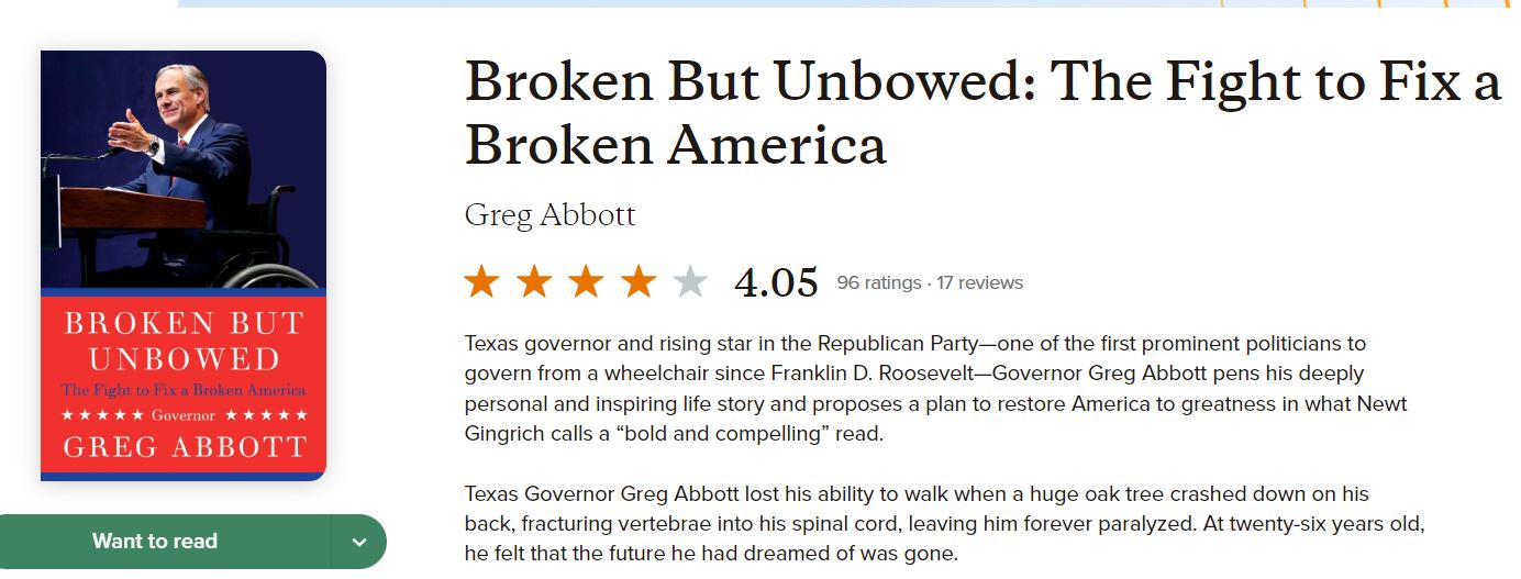 该书提出对美国宪法进行修改、限制联邦最高法院的权力,让各州政府享有更大自主权和自治权。回忆录的宣传文案把阿博特与前总统罗斯福相提并论,称阿博特是自罗斯福以来“第一个在轮椅上执政的著名政客”。