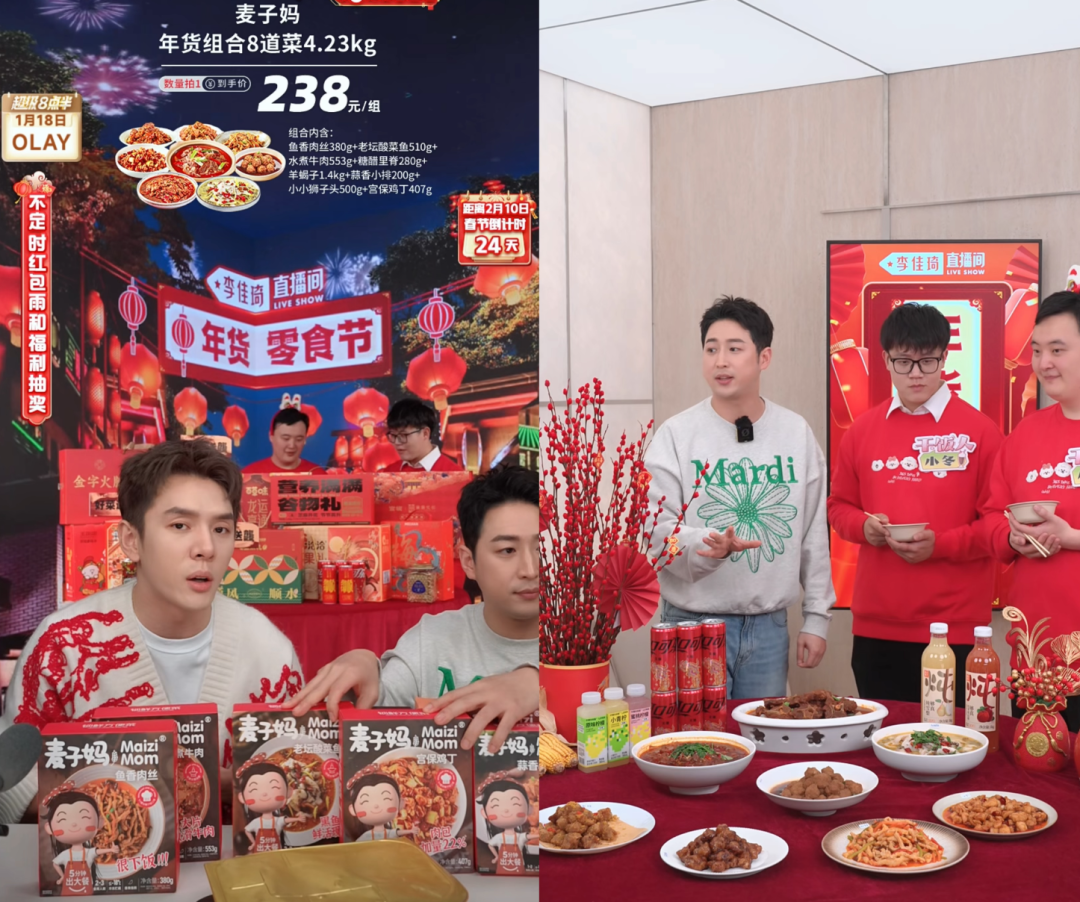 临近春节,品牌将年夜饭战场搬到了线上,一边在“猫狗拼”电商平台的旗舰店以及小红书和抖音商城上开展促销活动,一边借助大主播进行带货。在最近的年货节里,多个品牌的“预制年夜饭礼盒”轮番登上了李佳琦、罗永浩、烈儿宝贝、陈洁等主播的直播间。