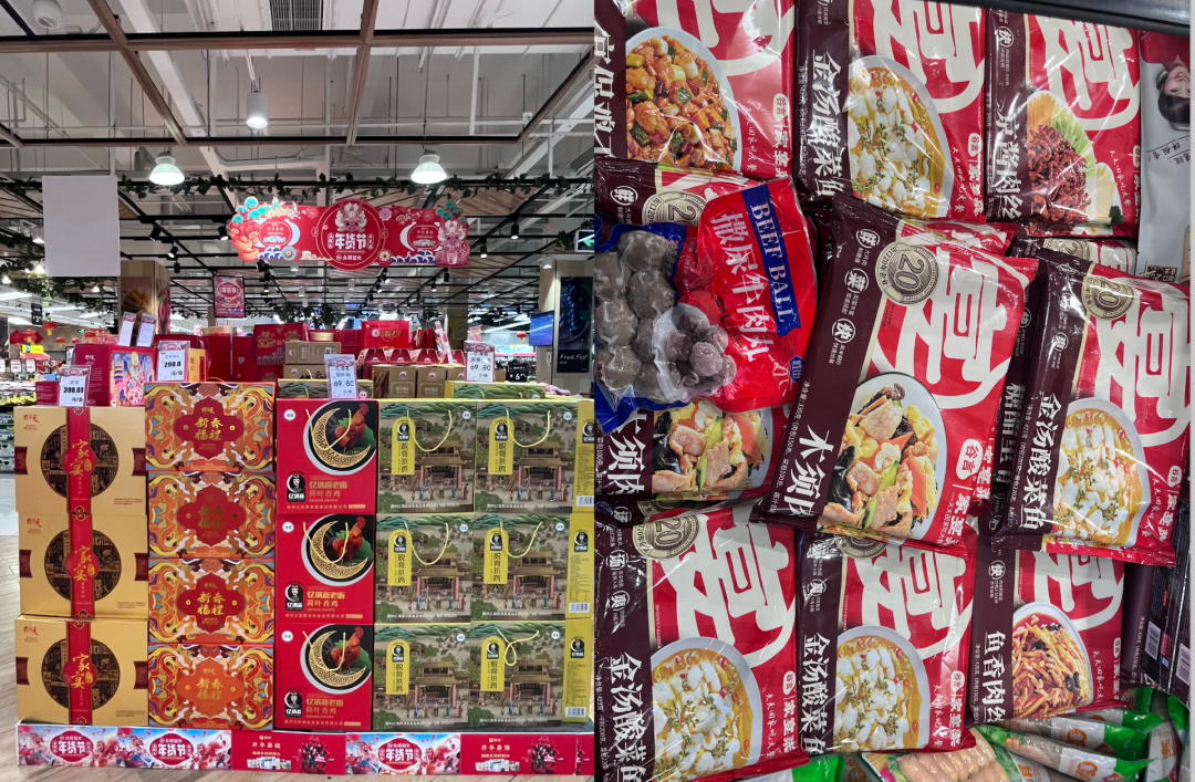 在北京的永辉、物美、沃尔玛等大型商超中,可以看到不少北京本地的餐饮品牌如全聚德等,纷纷推出了春节主题陈列,售卖家宴礼盒。线下售卖的年夜饭礼盒,部分是将店里卖得比较好的菜进行加工,采取真空方式密封保存,消费者购买后开封即可食用,属于即食类预制菜。