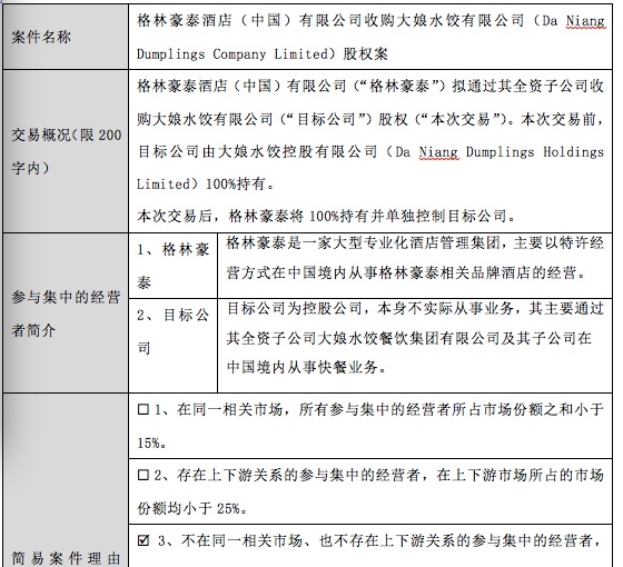 1月17日,商务部反垄断局官方网站发布的“经营者集中简易案件公示表”显示,格林豪泰酒店(中国)有限公司拟通过全资子公司收购大娘水饺有限公司(下称大娘水饺)100%股权。
