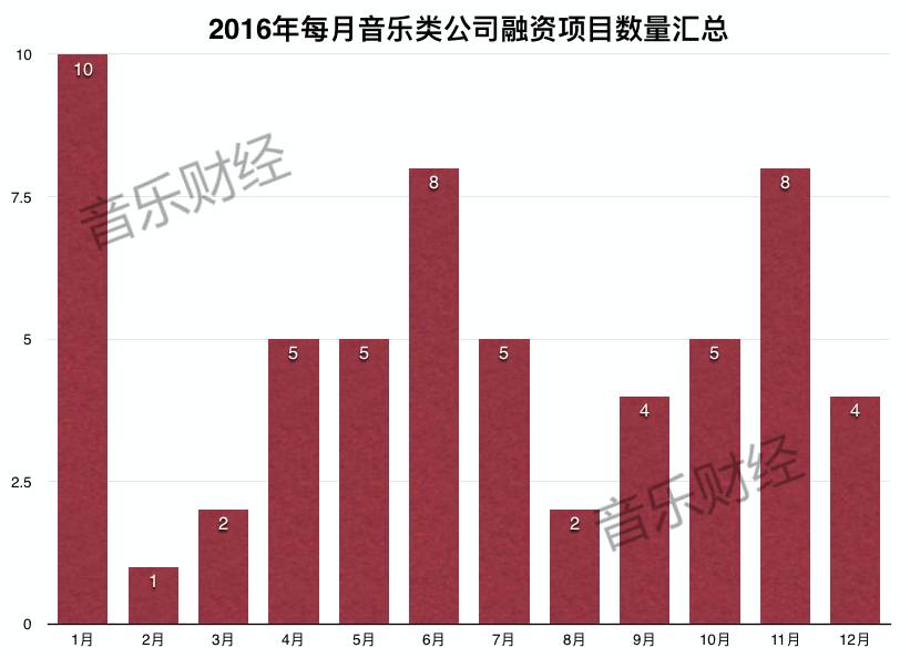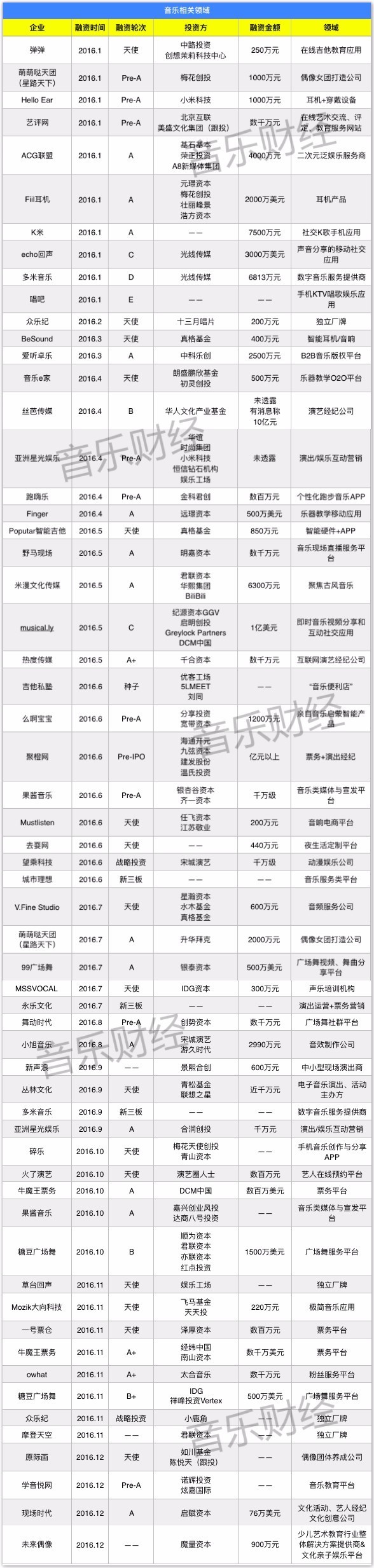 以下是音乐财经根据公开资料对2016年音乐类企业的融资情况(按月份)进行的不完全汇总: