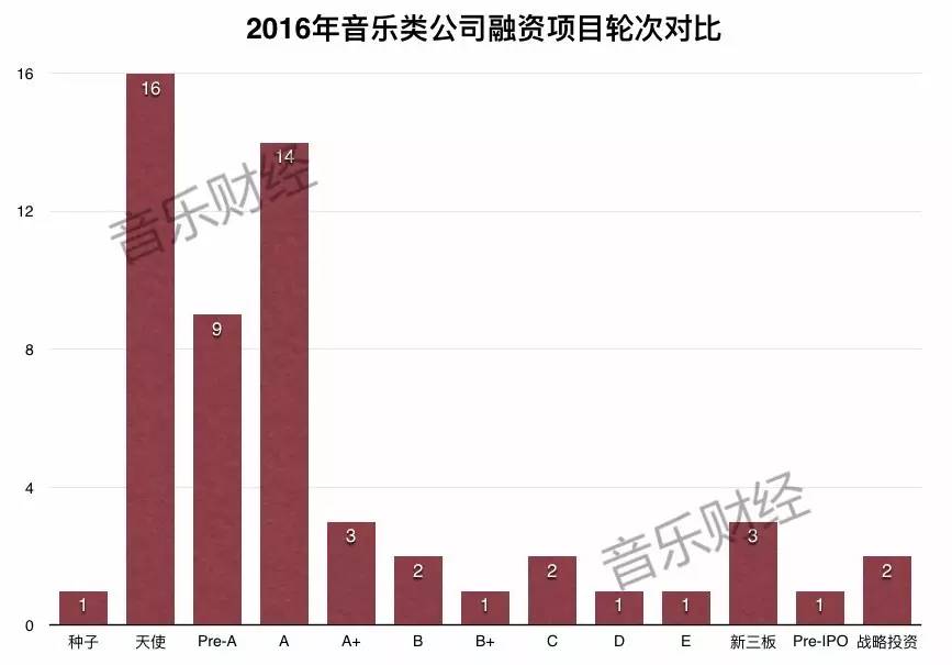 根据音乐财经的统计,2016年全年,音乐产业共有59起融资事件,涉及到52家音乐类企业,其中有7家企业进行了两次融资,分别是萌萌哒天团、多米音乐(9月挂牌新三板)、众乐纪、亚洲星光娱乐、果酱音乐、糖豆广场舞及牛魔王票务。融资轮次方面,完成天使轮、A轮和Pre-A轮三个早期阶段融资的音乐类融资项目共达到了39个,占全部项目的66%。
