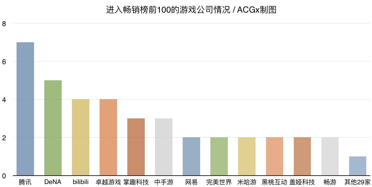 据ACGx统计的数据显示,共有41家游戏公司推出的66款二次元手游产品曾进入了IOS畅销榜前100。如上图所示,腾讯以7款手游产品的成绩占据榜首,拥有大量日本IP资源的DeNA则以5款手游产品的成绩紧随其后。有趣的是,虽然卓越游戏与bilibili均有4款手游进入了IOS畅销榜前100,但前者推出的4款手游均是《我叫MT》系列产品。而更多的游戏厂商,则是以1-3款手游的成绩出现在了这个榜单中。