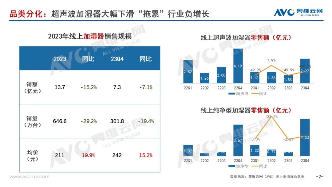 2023年对于所有品质提升类的品类来说可谓是烈火见真金,在消费者信心持续低位徘徊的情况下,只有相对“刚需”的品类能够在Q1和12月的维持下仅有小幅下滑。而在此背景下,整个加湿器市场则显得较为惨淡,据奥维云网(AVC)线上推总数据,2023年线上市场销量大幅下滑为647万台,同比-29.2%,零售额则相对较好为13.7亿元,同比-15.2%。从全年来看,受限于Q1的疫情恢复期和12月的外部环境影响,加湿器市场呈现需求的快速萎缩。但分品类来看,纯净型加湿器全年仍维持较高的增长,大盘下滑主要是被超声波加湿器所拖累。