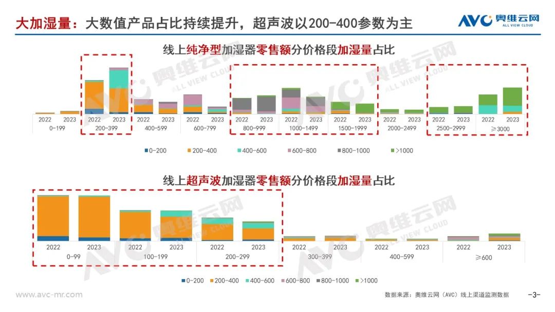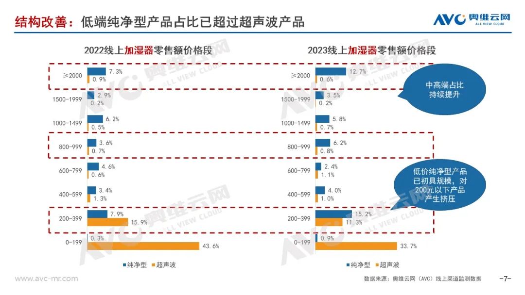 而从价格段来看的话会更明显一点,相比去年最明显的增长点还是高端、中高端产品补齐和低端产品对超声波加湿器的替代,尤其是200-400这个价格段的纯净型产品的增长首先冲击的就是200元以下的超声波加湿器市场,同比去年这部分减少了10%。低端纯净型的增长有效提升了行业的均价。除此之外,2023年低端纯净型产品的快速迭代,2022年的低端产品在产品力上还是不如超声波的,但是2023年低端纯净型产品基本上参数都有一定的升级,价格也没有太大的变化。消费者在购买的时候会有明显的感知,纯净型加湿器虽然比超声波加湿器贵了一点,但是加湿量也升级了,还更健康没有水雾,会有比较好的产品体验。