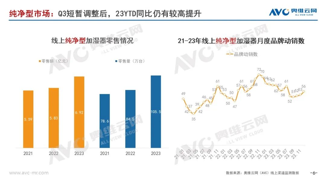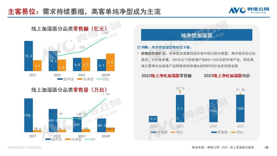 而在2024年,我们预测纯净型增长仍是拉动行业增长的主要动力,分开价格段来看,主要是低端增长拉动纯净型量的增长。而在中端,到了2023年下半年价格持续下探,已经到了800-1000价位,24年这段将持续增长,而在高端这边,主要是净化加湿这类产品拉动高端占比提升,在24年有望出现更多的产品拉动占比持续提升。