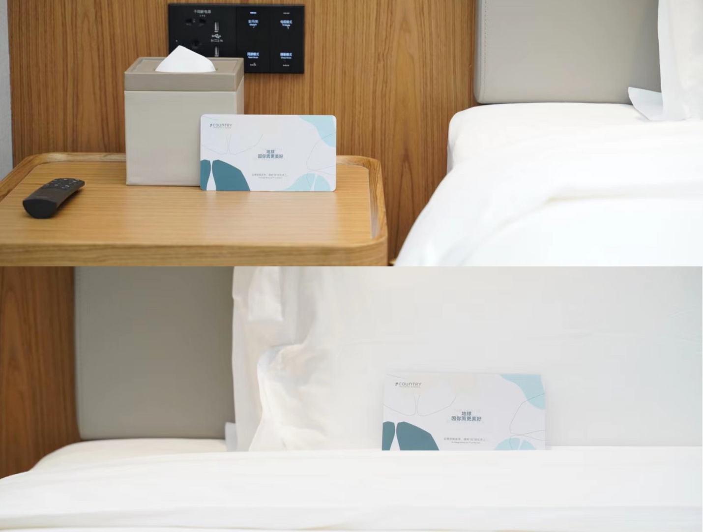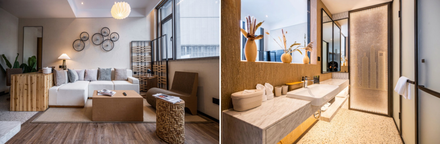 除了上述融入旅居体验的产品细节改进之外,在绿色建筑的议题上,锦江则持续推进“可持续发展主题样板间”的研发,从房间的基础施工阶段、硬装、软装、到运营物资,更加多方位地考虑了再生物资的可利用性,在设计之初就在低碳再生、循环经济等方向作出指引。例如在硬装上,用草木灰制成墙面、秸秆铺成地板,用玻璃和石材的废料打造卫生间的水磨石地砖;在软装上,用再生纸制成灯具,用回收加工过的瓦楞纸打造高强度、轻量化的现代家具。就连客房内的马克杯、茶托盘、收纳盒以及垃圾桶皆使用密胺混合30%咖啡渣制作而成,安全耐摔,并且每一个都拥有天然的独一无二的咖啡渣肌理。
