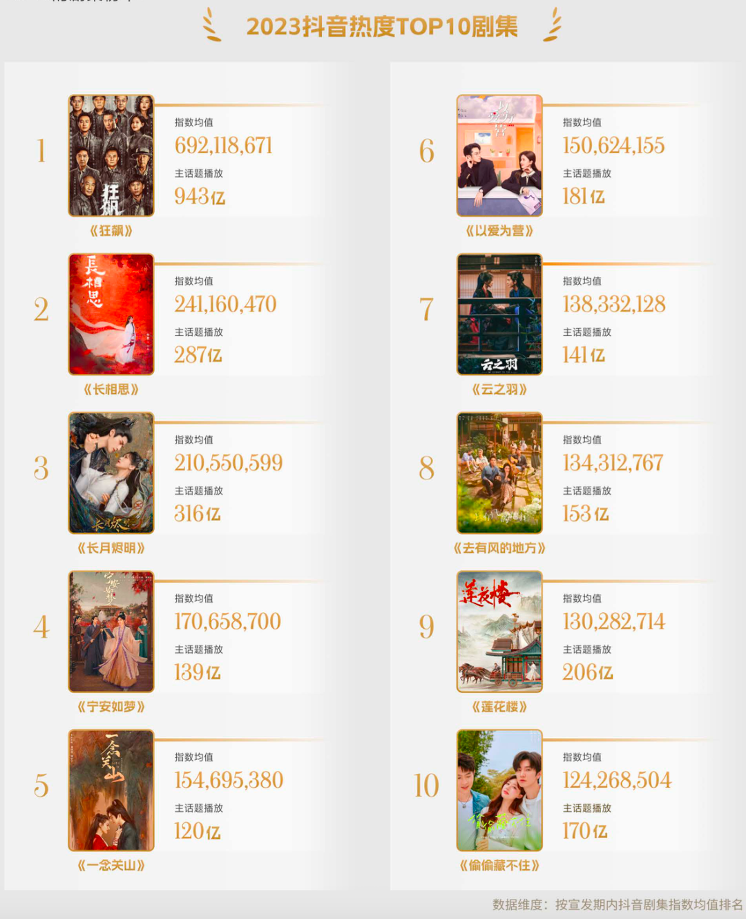 刚刚发布的《2023抖音剧集年度报告》显示,2023上线剧集在抖音主话题下共发布并收获了1863万条视频,播放量达到4934.9亿、同比增长10%,总点赞量达83亿+(同比增长41%)。以抖音为代表的短视频平台,给了更多好内容充分展示魅力的舞台,让不少爆款剧集以更快的速度实现了出圈。