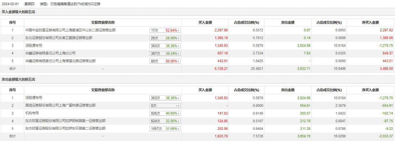 华西股份2月1日涨停,全天换手率达4%,振幅达10.36%。龙虎榜数据显示,营业部席位合计净买入2741.88万元。其中,机构买入147.83万元,卖出250.57万元,合计净卖出102.74万元。此外,中国中金财富证券有限公司上海黄浦区中山东二路证券营业部、东北证券长春卫星路证券营业部分别买入2297.89万元、1385.19万元;深股通专用、国信证券上海广富林路证券营业部分别卖出2624.68万元、554.91万元。