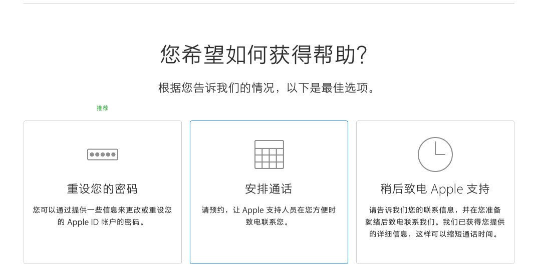 所以如果你的 Apple ID 被锁定,爱范儿(微信号:ifanr)建议你直接在苹果的客服网站(网站链接点这里)上进行登记,选择自己合适的时间让苹果客服直接拨打你的电话,这样的话即使仍然需要等待高级客服很长时间,自己的话费是省下了。