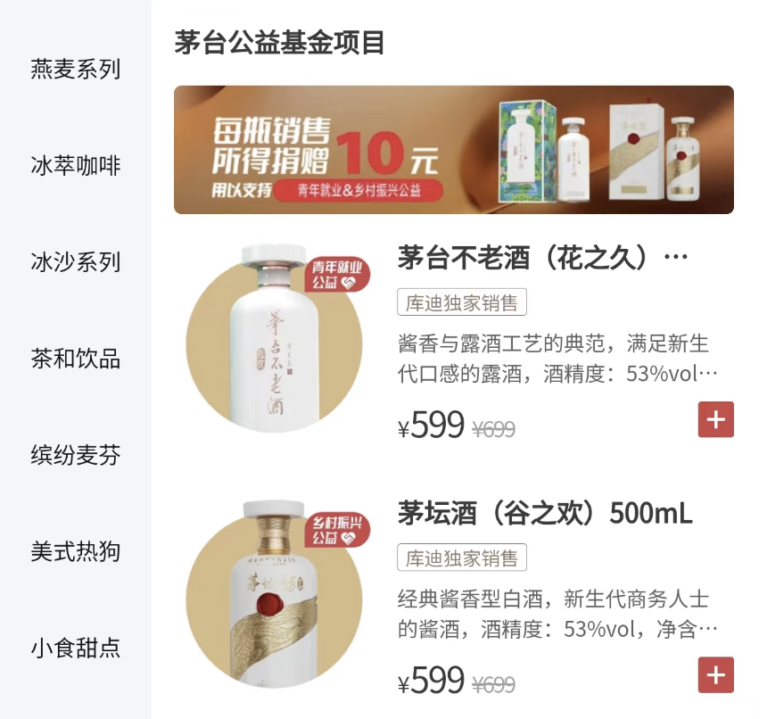 所谓卖酒并非大众认知中的“茅台酒”,而是指库迪咖啡独家销售茅台保健酒公司两款新品茅台不老酒(花之久)和茅坛酒(谷之欢),售价599元/瓶。去年12月,茅台公益基金会与库迪咖啡曾宣布成立茅台不老酒(花之久)青年就业基金和茅坛酒(谷之欢)乡村振兴基金,基金名分别对应两款新品。