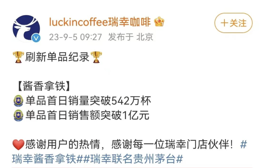 瑞幸官方数据显示,去年9月4日,酱香拿铁首日销量高达542万杯、首日销售额突破1亿元。另据茅台披露,2023年,酱香拿铁销售约4000万杯。